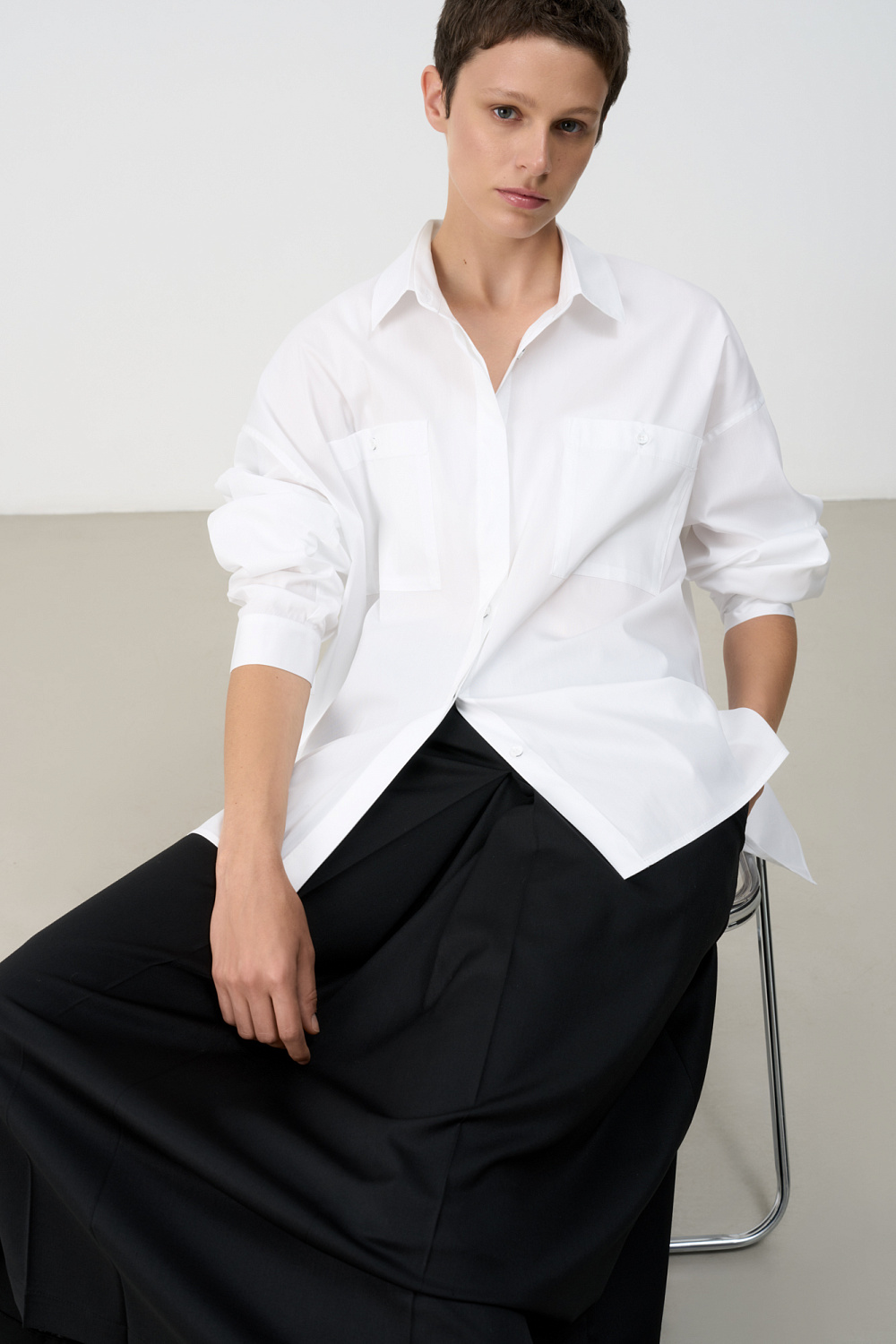 Shirt with patch pockets. Turn-down collar, long sleeves with buttoned cuffs. Button closure under the placket