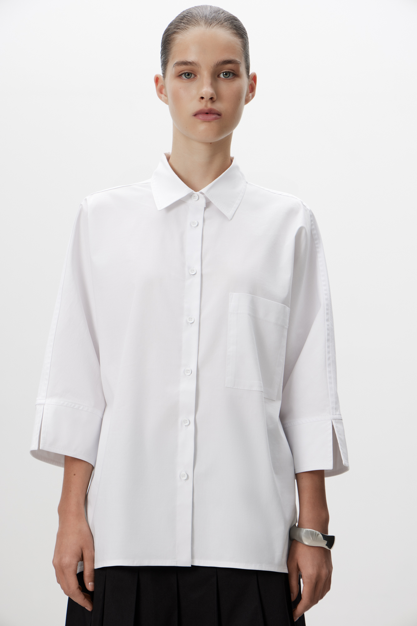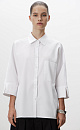 Basic cotton shirt with a patch pocket on the chest and 3/4 sleeves. Asymmetrical hem, longer at back. Button fastening.