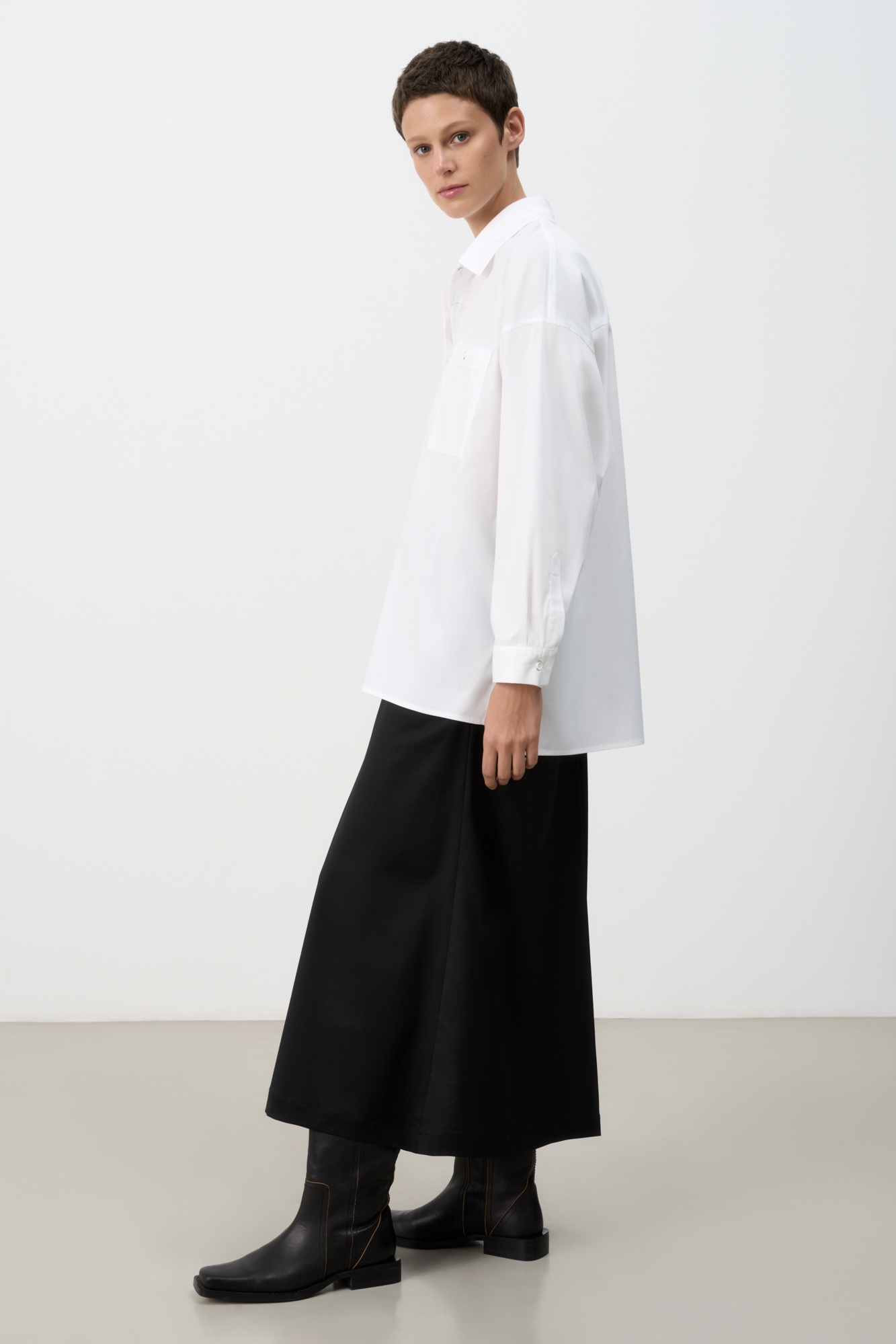 Shirt with patch pockets. Turn-down collar, long sleeves with buttoned cuffs. Button closure under the placket