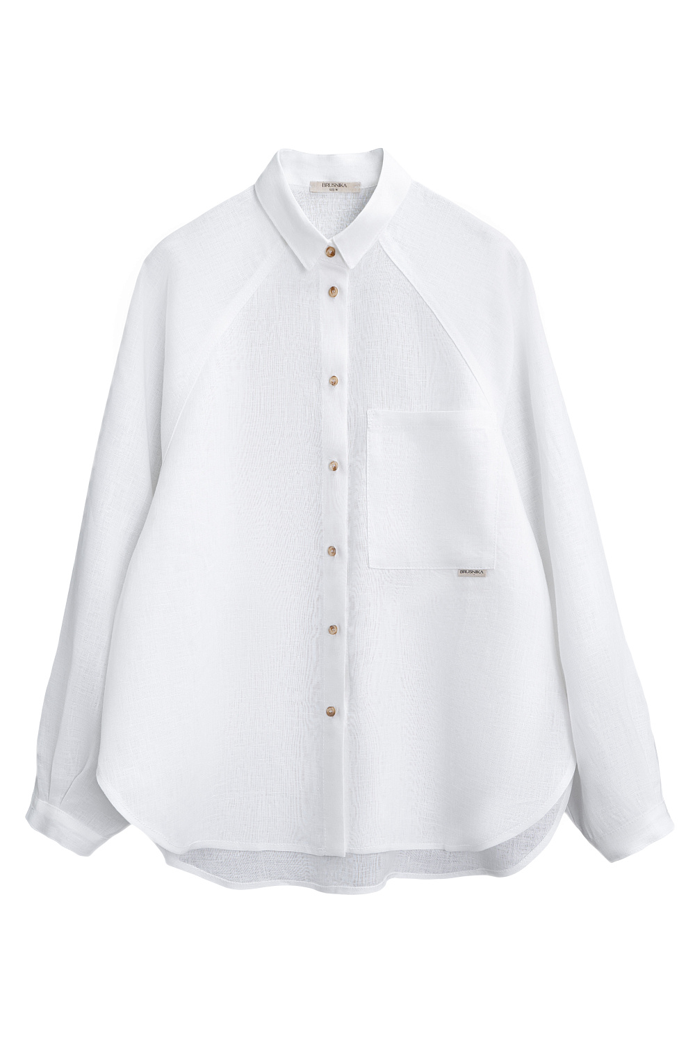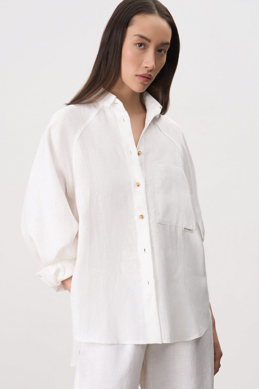 100% linen shirt with raglan sleeves. The model has a loose fit, long sleeves with short cuffs, a classic turn-down collar and a chest pocket with a branded label. Button closure.