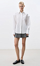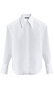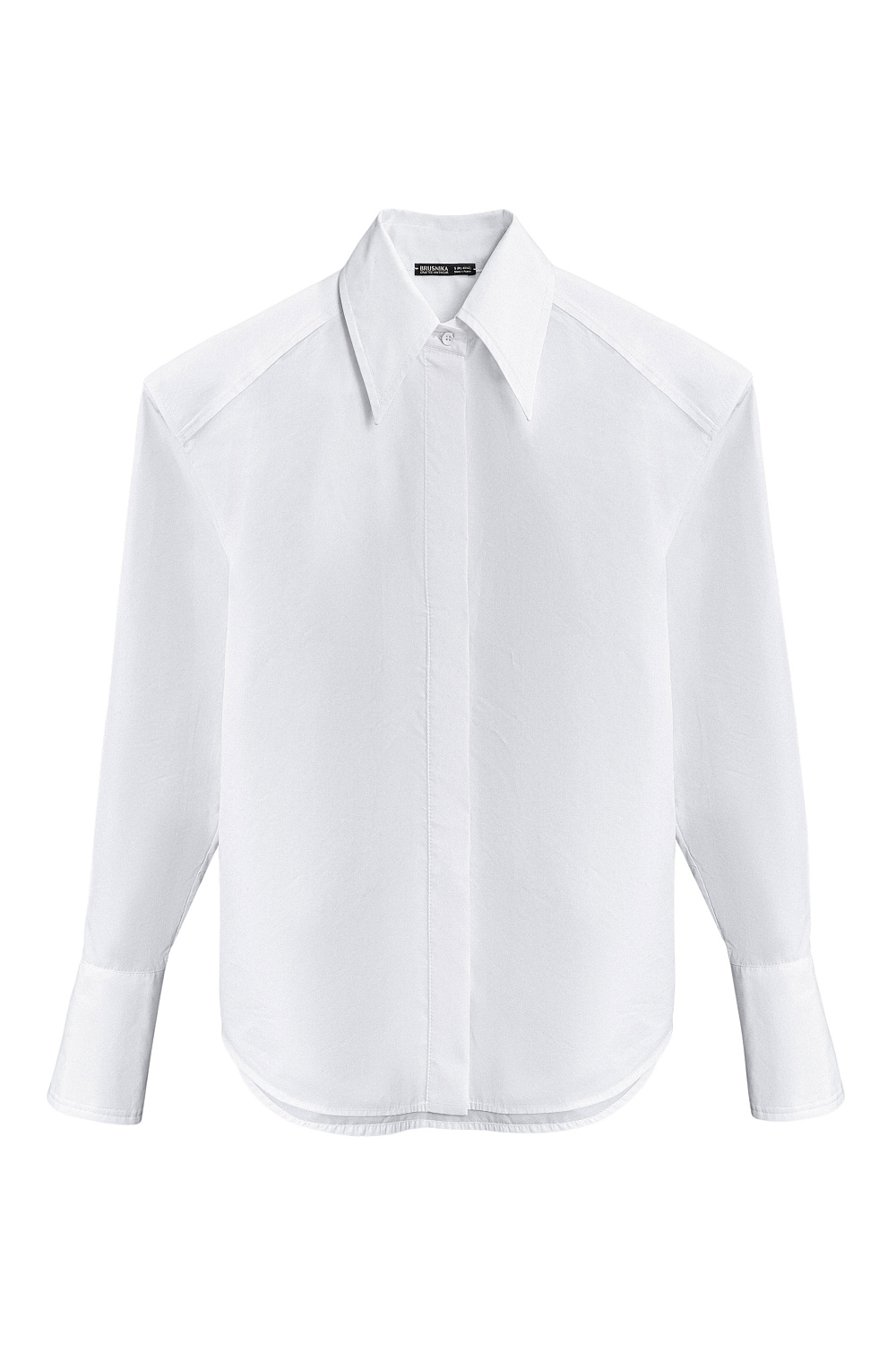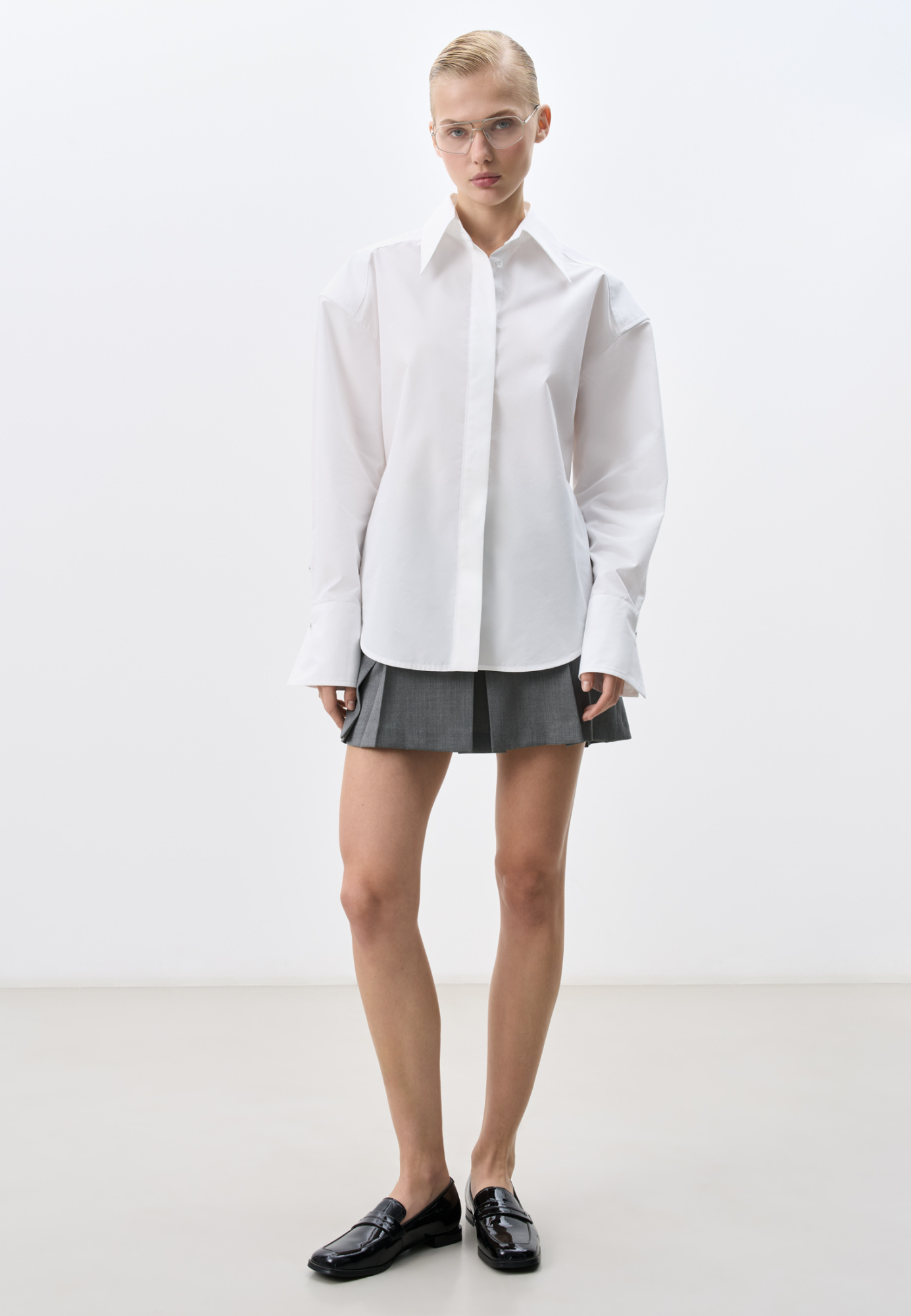 Cotton shirt. The model has a straight fit, long sleeves with cuffs, a classic turn-down collar, enlarged shoulders and a tie at the back. Button fastening under the placket.