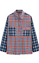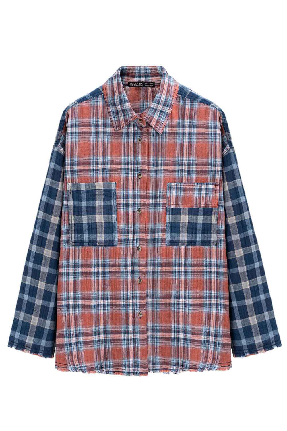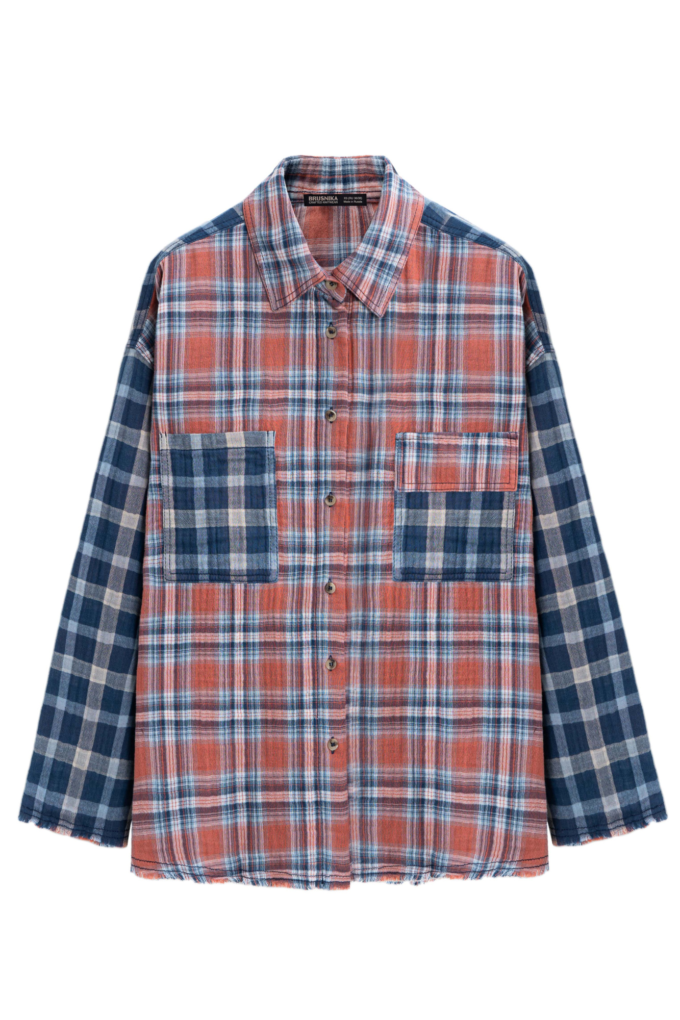 100% cotton checkered shirt. The model has a straight cut, with dropped shoulders, long sleeves, a classic turn-down collar, two chest pockets, one of them with a flap. The cuffs and hem of the product are made with a raw edge effect. Button closure.