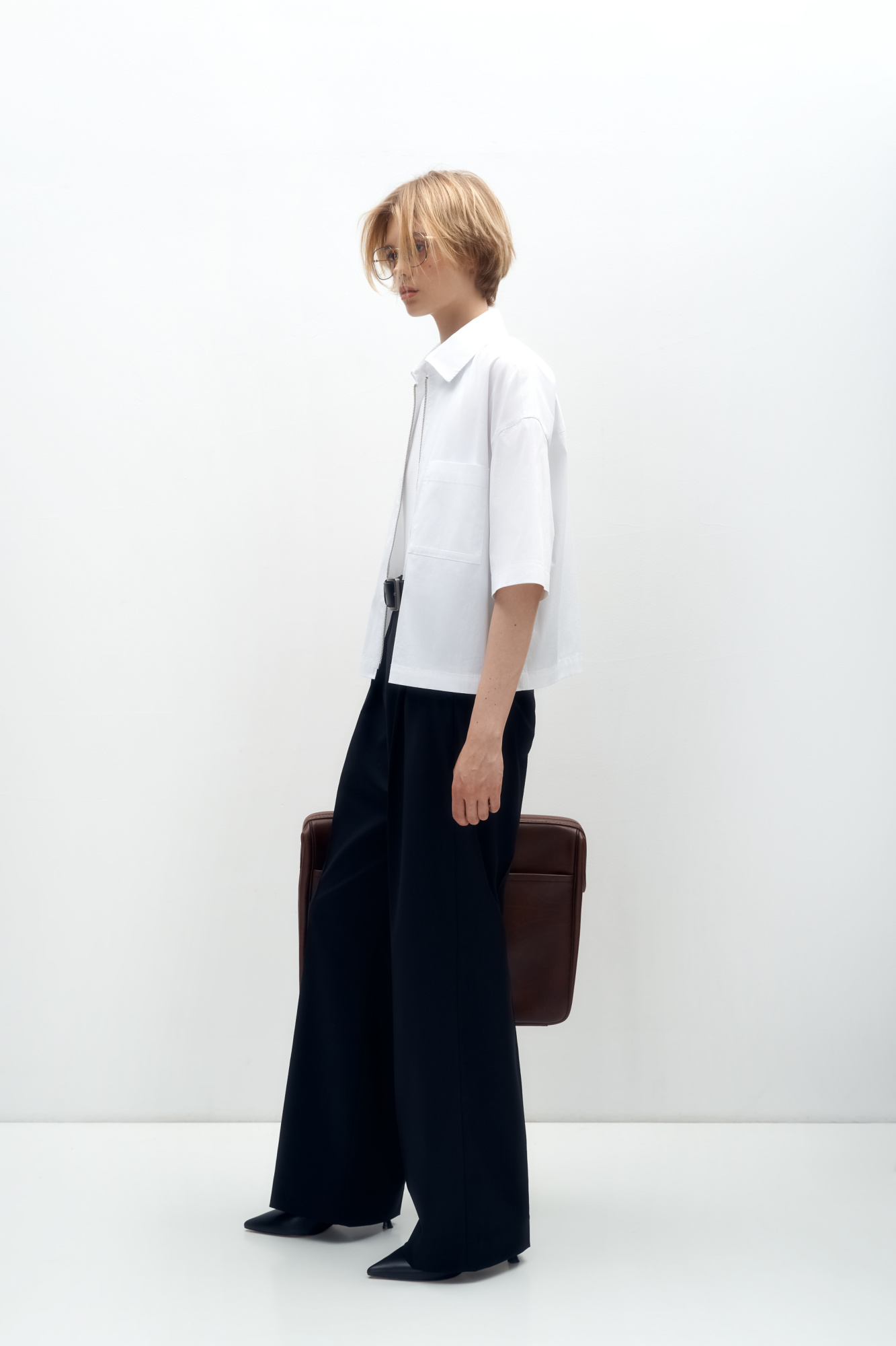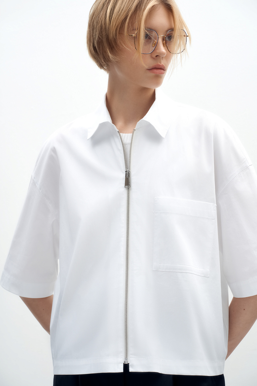 Shirt with dropped sleeves, patch pocket on the chest and zip fastening.