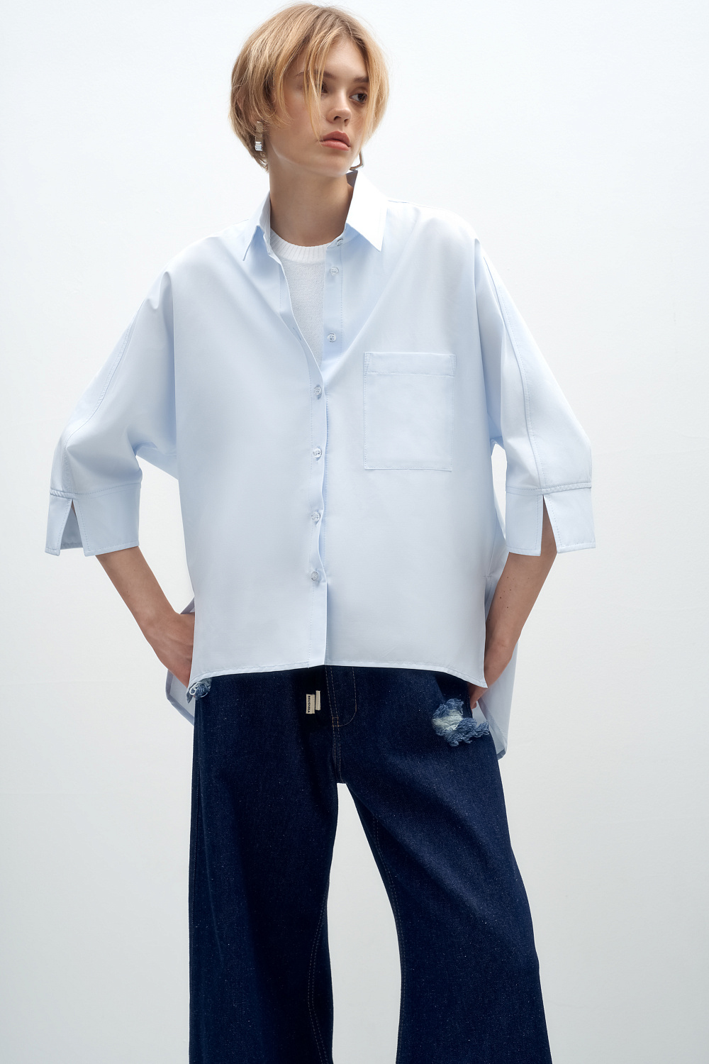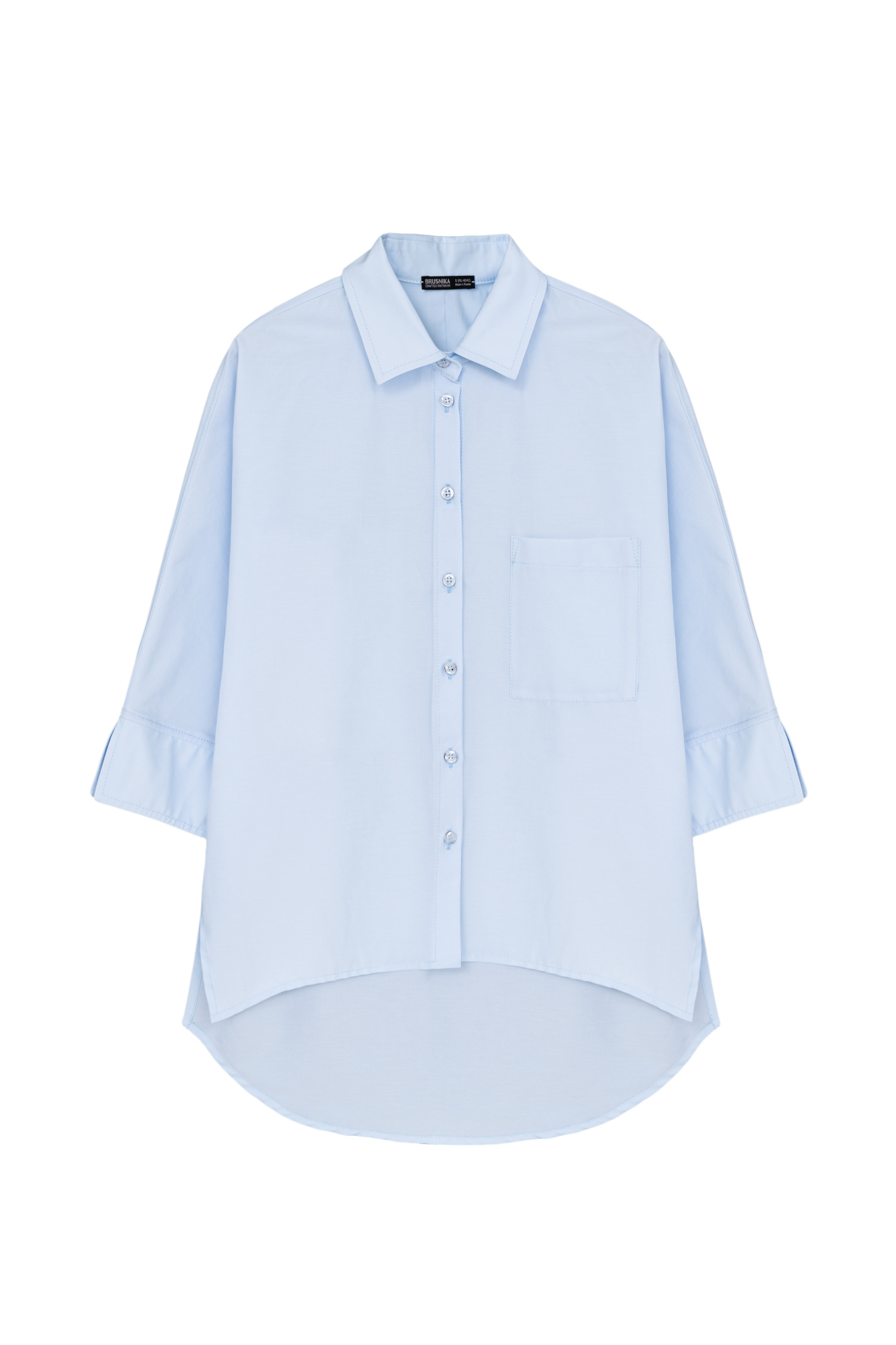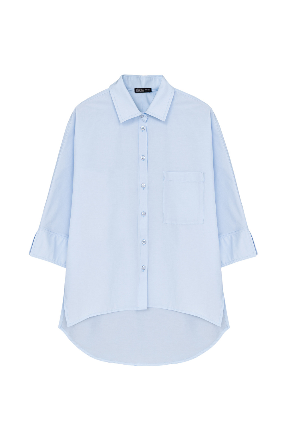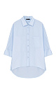 Basic cotton shirt with a patch pocket on the chest and 3/4 sleeves. Asymmetrical hem, longer at back. Button fastening