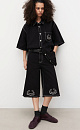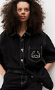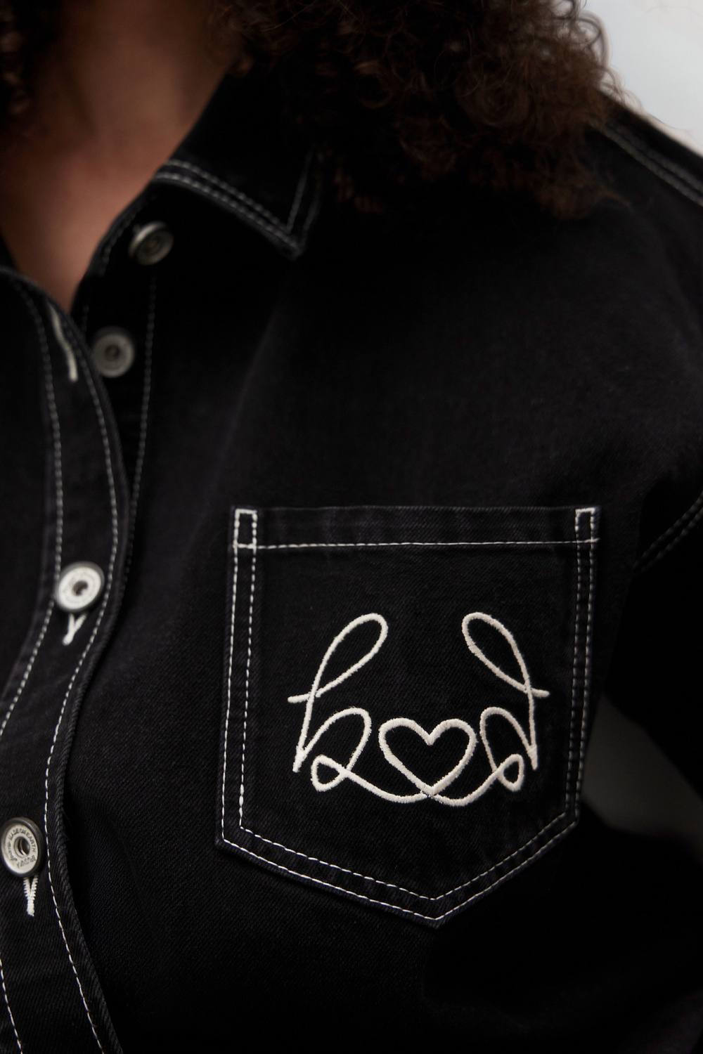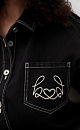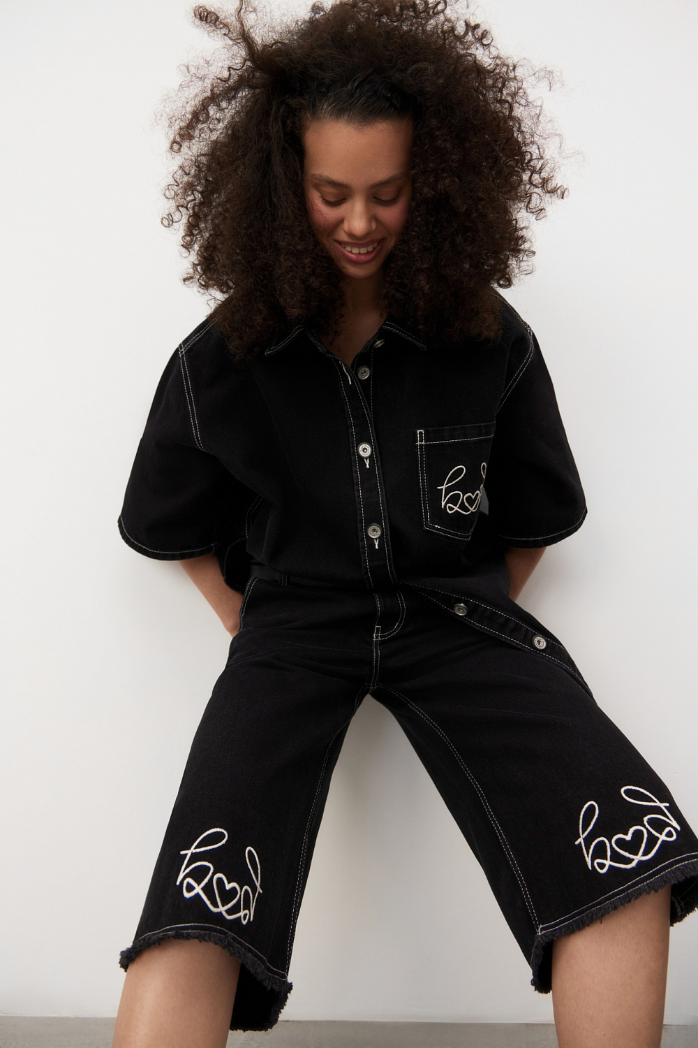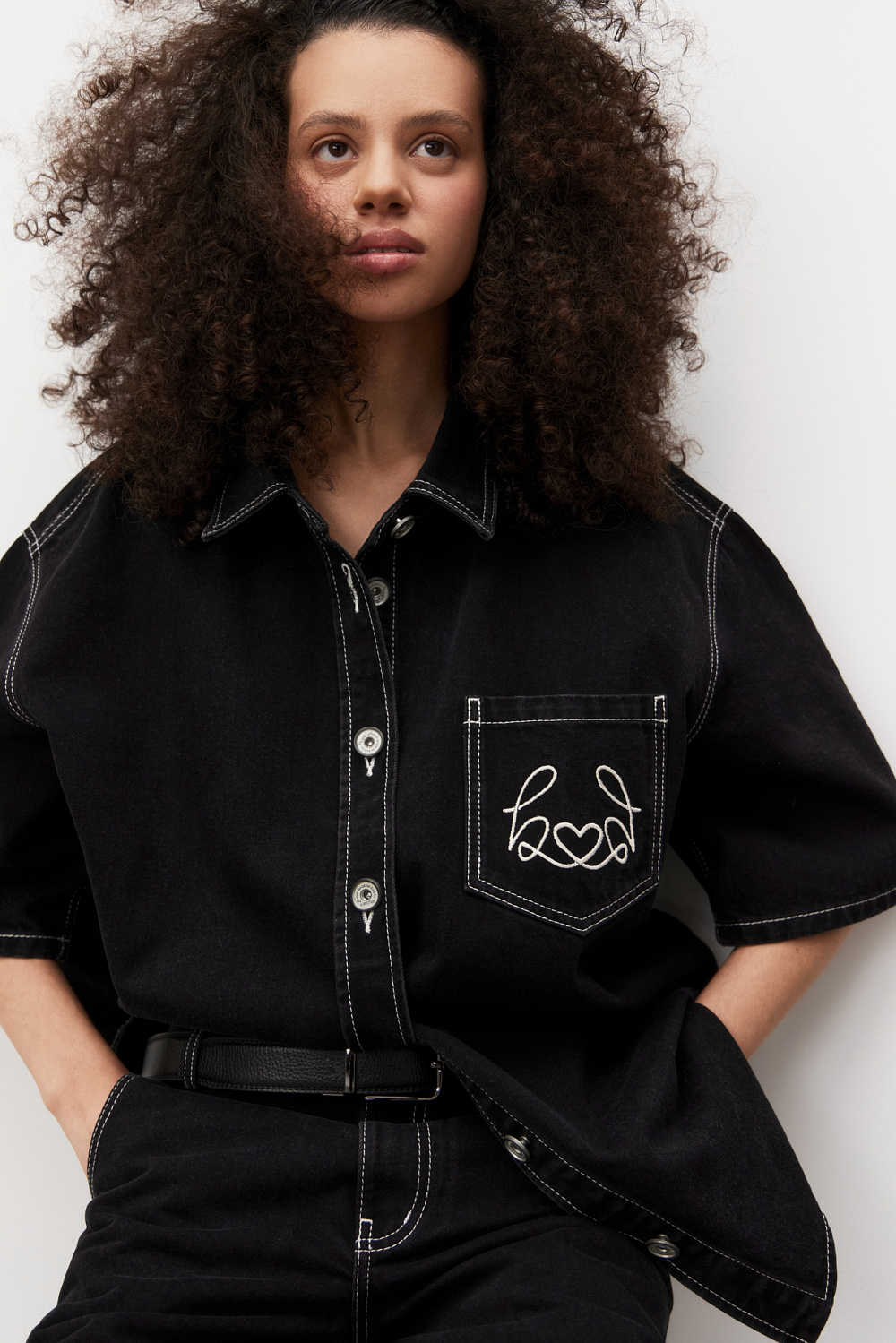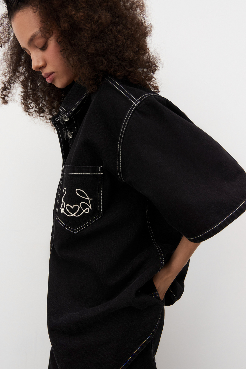 100% cotton denim shirt. Loose fit model with a classic turn-down collar and short sleeves. The shirt is complemented by a chest pocket decorated with heart-shaped embroidery. Button closure.
