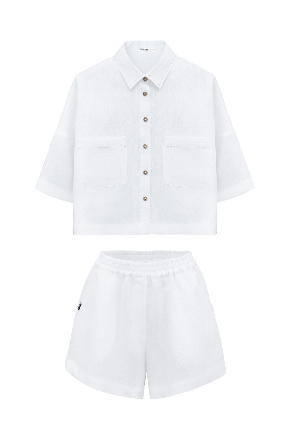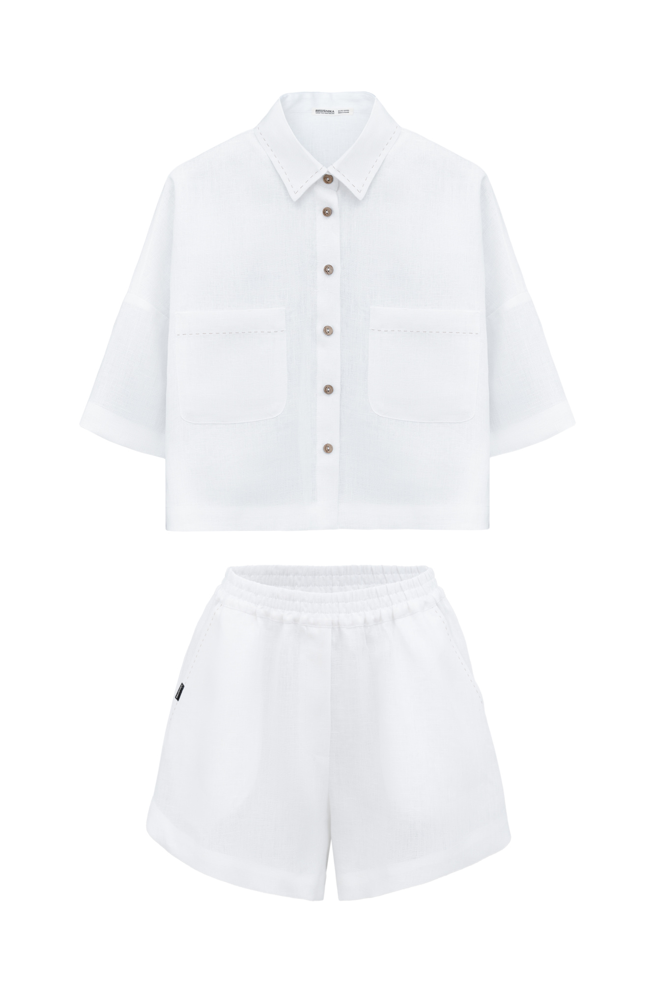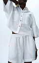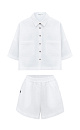 The set includes a cropped shirt with patch pockets, dropped shoulders and shorts with side pockets and an elastic waistband.