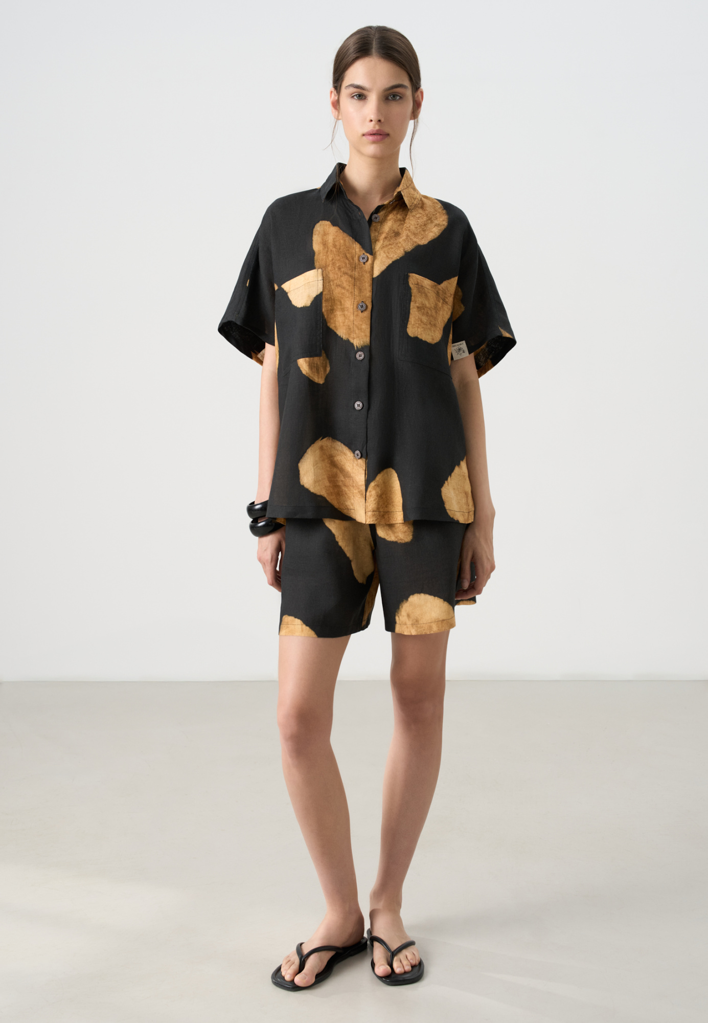 Printed set made of 100% linen. Shirt with short sleeves, turn-down collar and patch pockets on the chest. Short straight-fit shorts with side pockets and an elastic waistband.