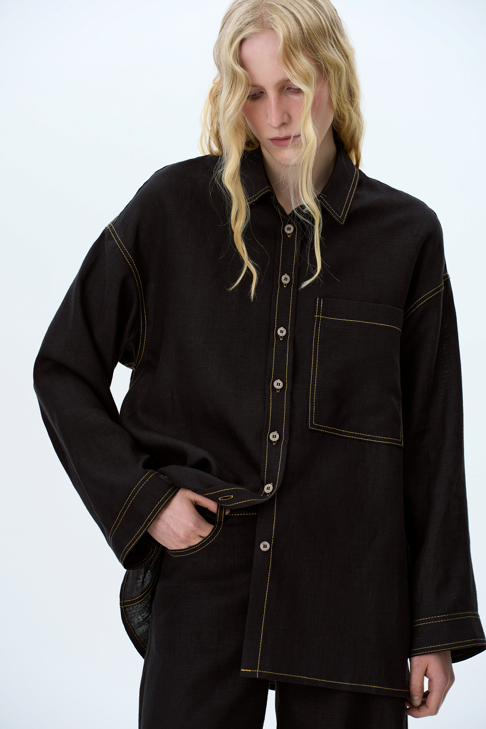 Linen shirt with a patch pocket on the chest. Features loose silhouette with a logo on the sleeve.