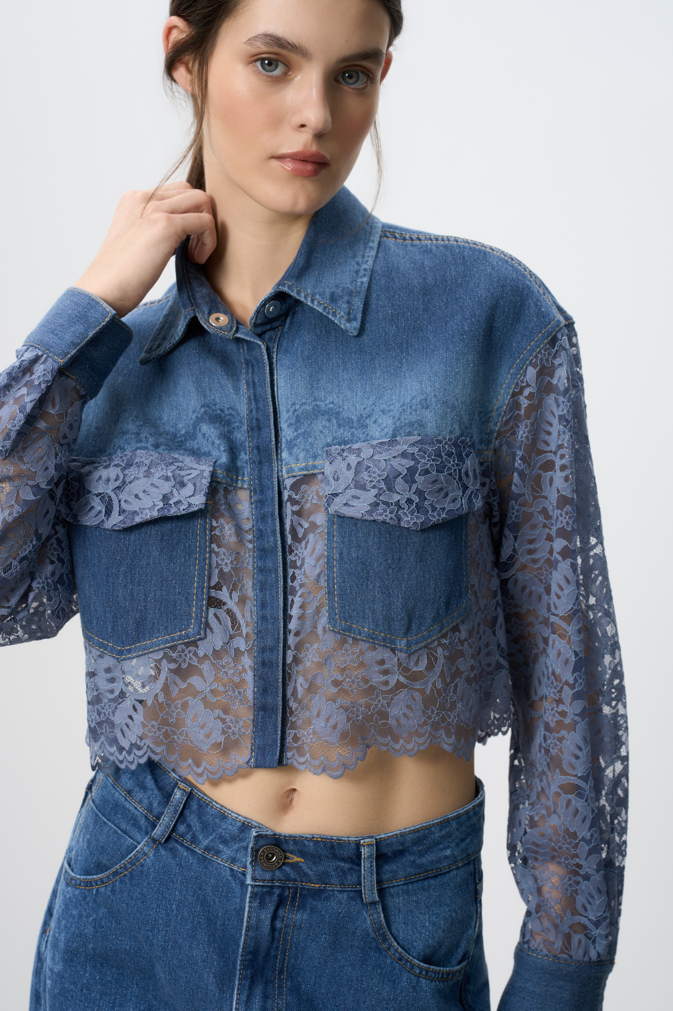 Cropped shirt with lace. Loose silhouette model with patch pockets. Snap and button closure.