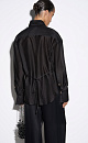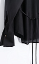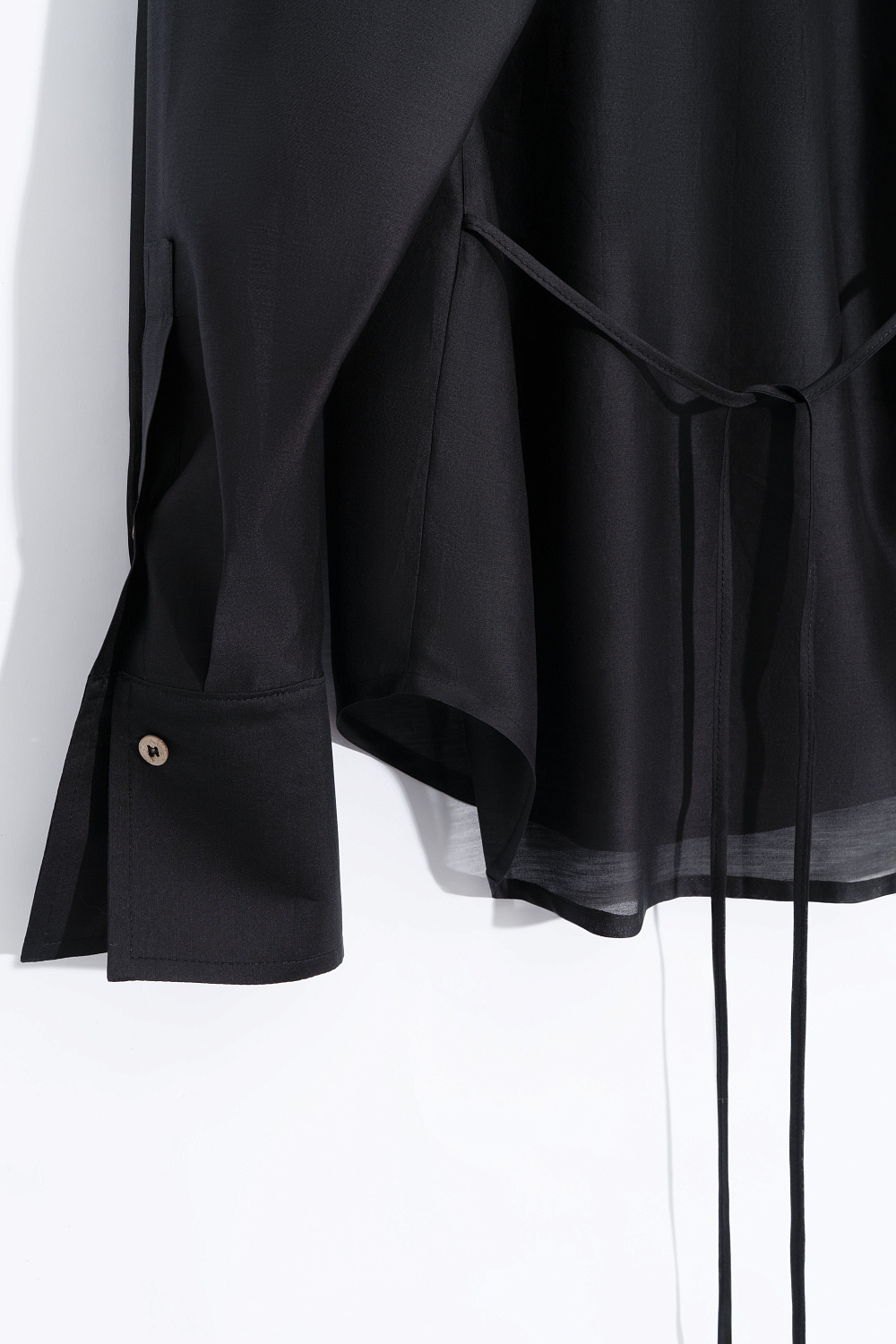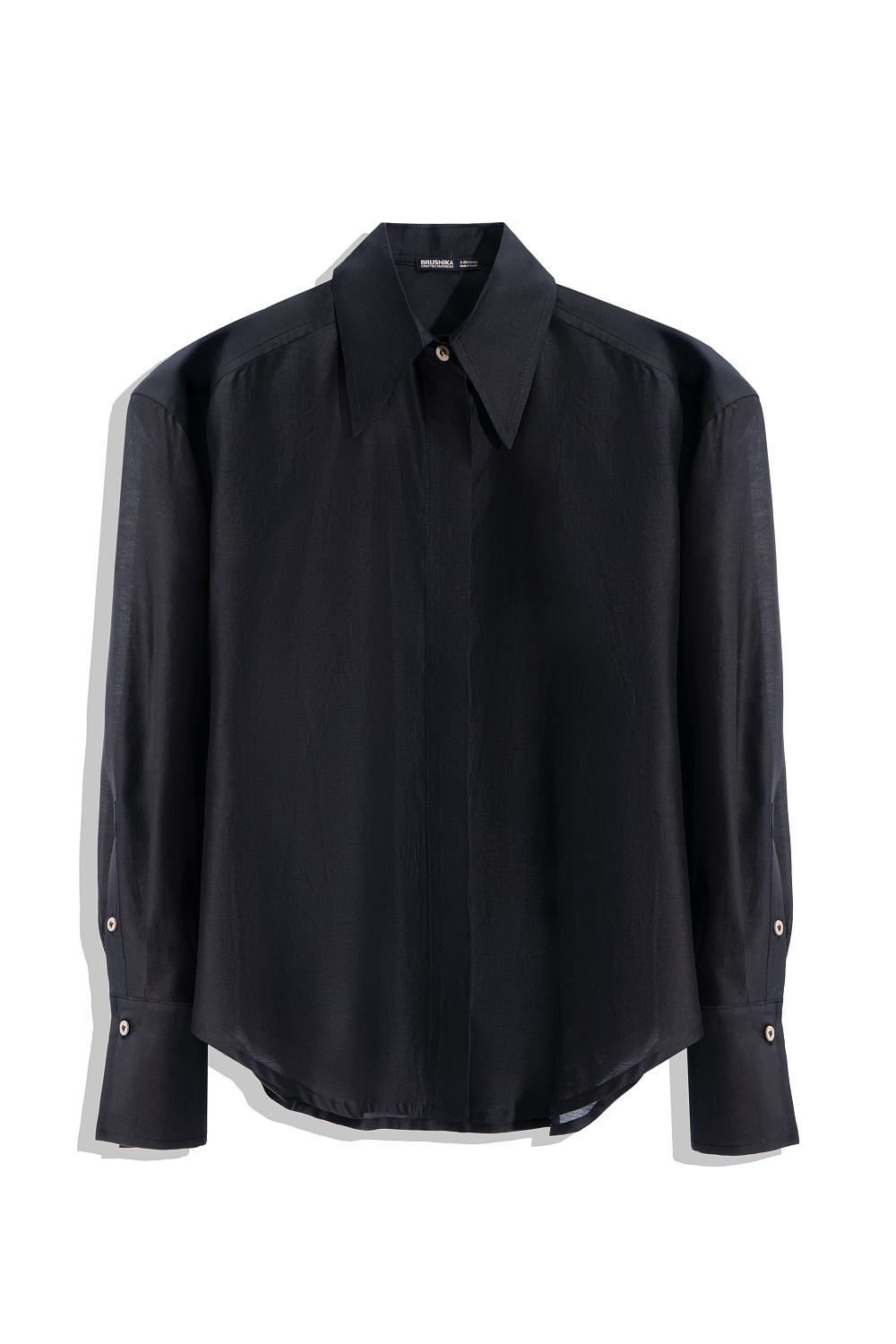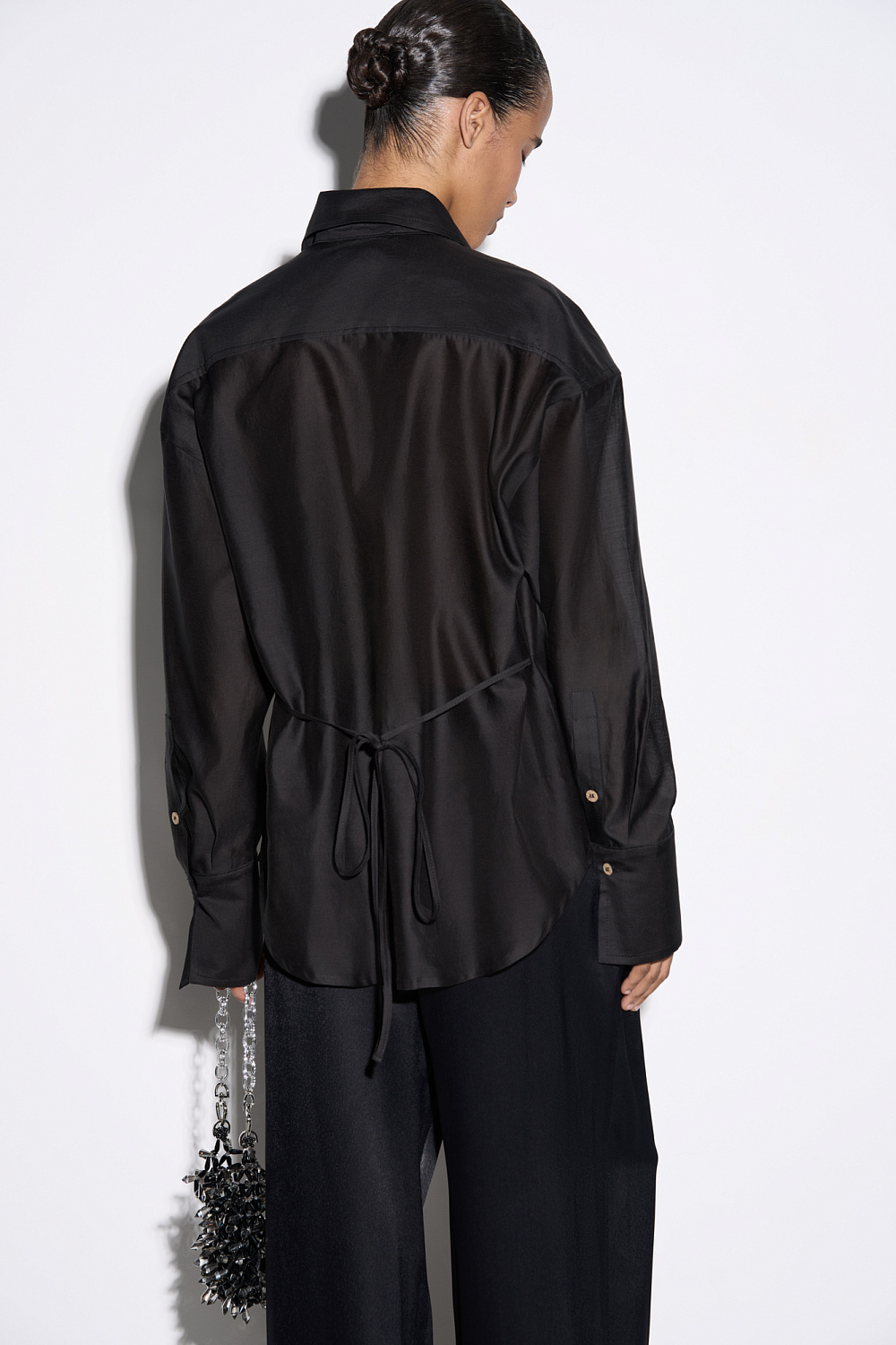 Shirt made of silk with added cotton. Straight fit model with long sleeves with cuffs, a classic turn-down collar, extended shoulders and a tie at the back. Button fastening under the placket.