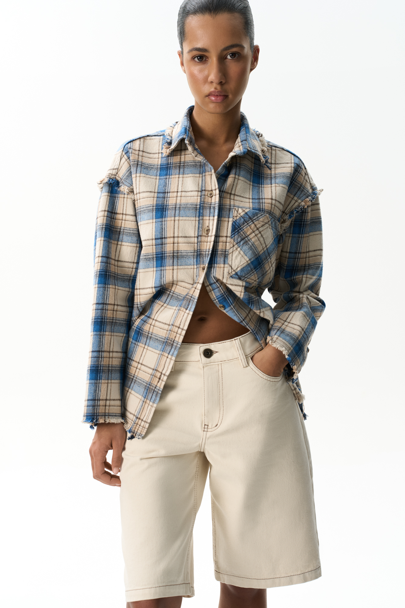 Bermuda shorts with belt loops and pockets. Front zip and metal button fastening.