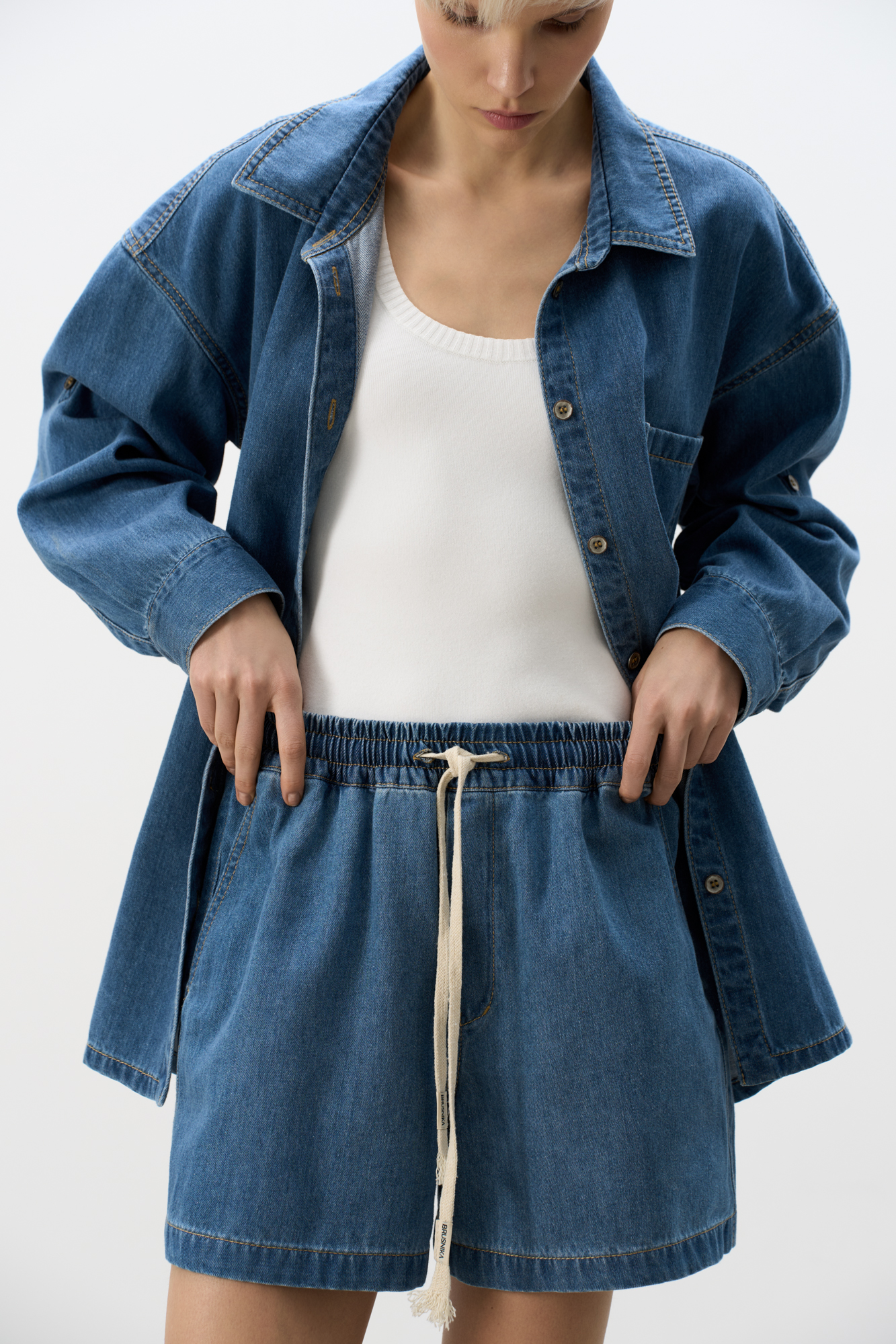 Denim shorts made of 100% cotton. The model has a straight cut, mid-rise, with a wide belt and pockets. The product is made on a drawstring.