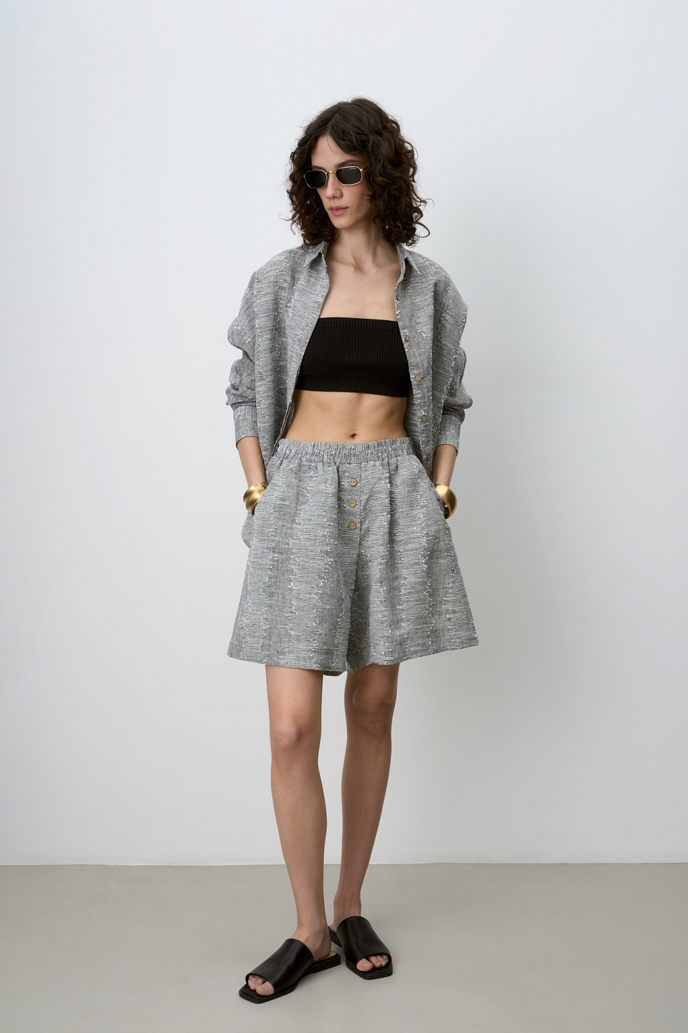 Textured linen shorts. Straight-fit model with an elasticated waistband, two pockets and button decoration.