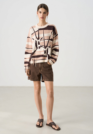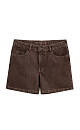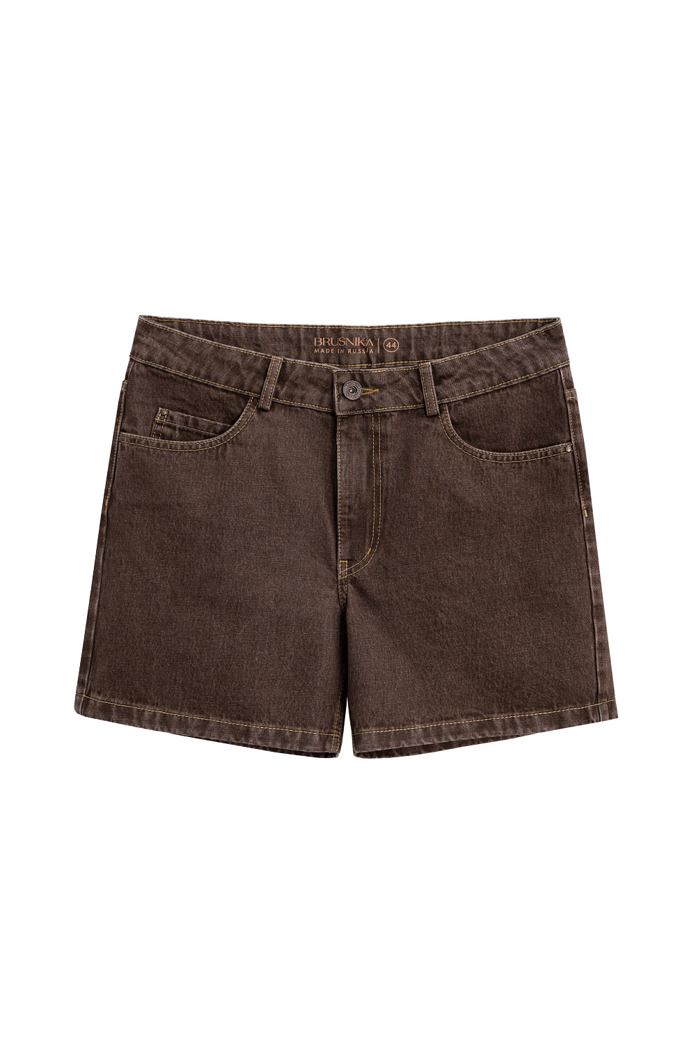 Denim shorts made of 100% cotton. The model has a straight cut, five pockets, patches on the waistband for a belt and a zipper and button fastening. The product is decorated with branded leather jacron.