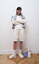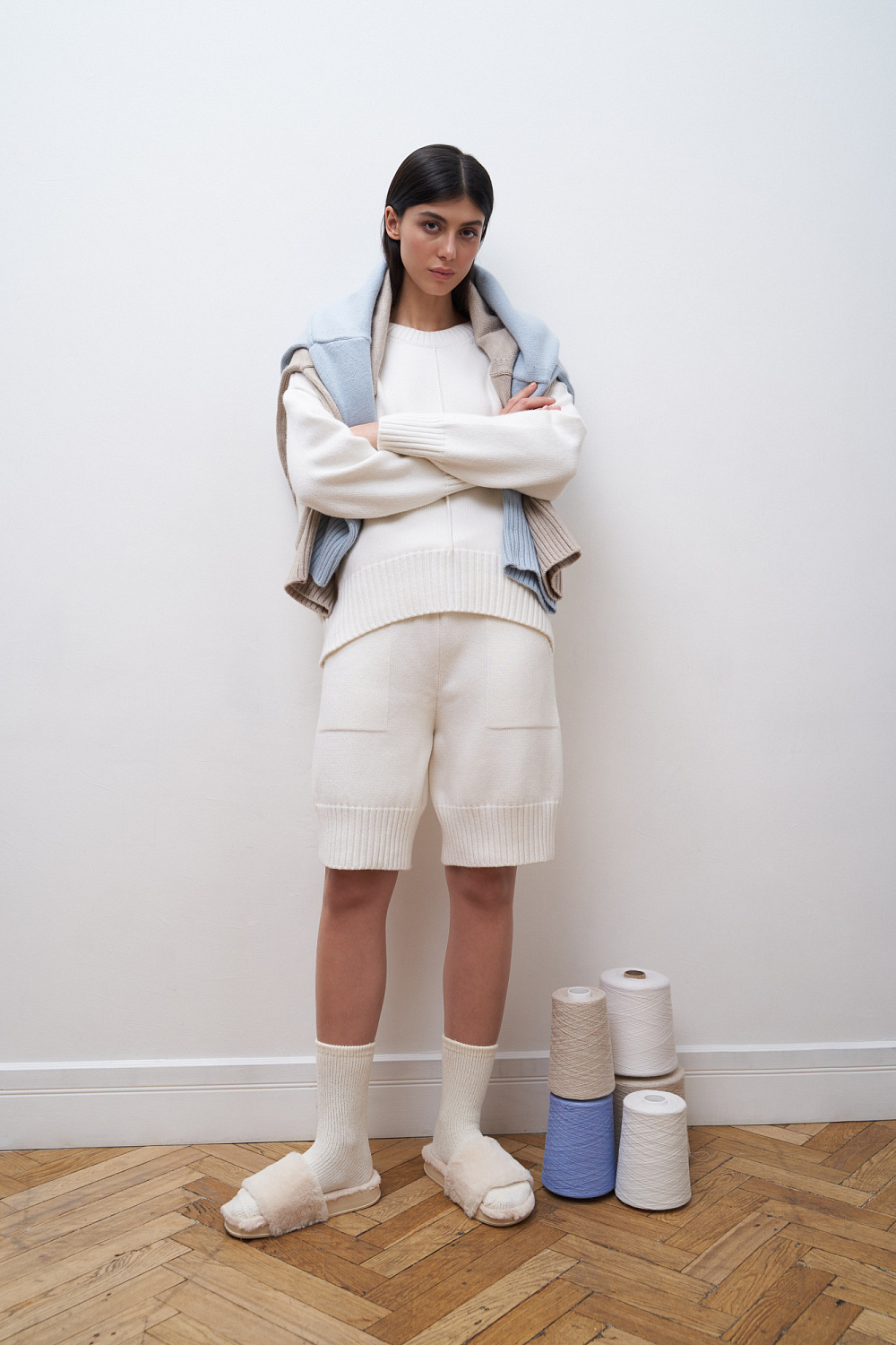 Long knitted shorts with wide elastic. Model with side pockets. Drawstring on the belt.