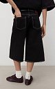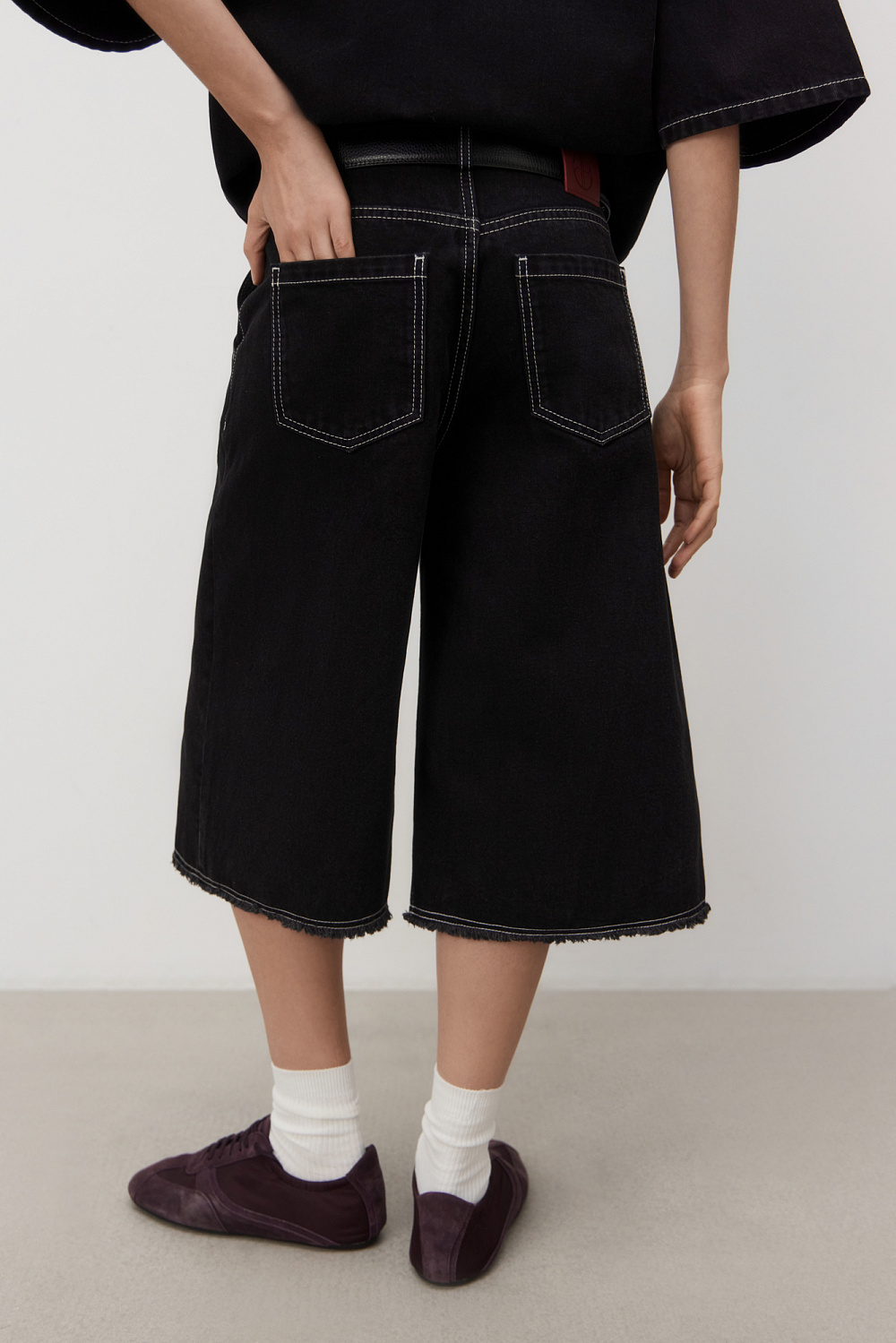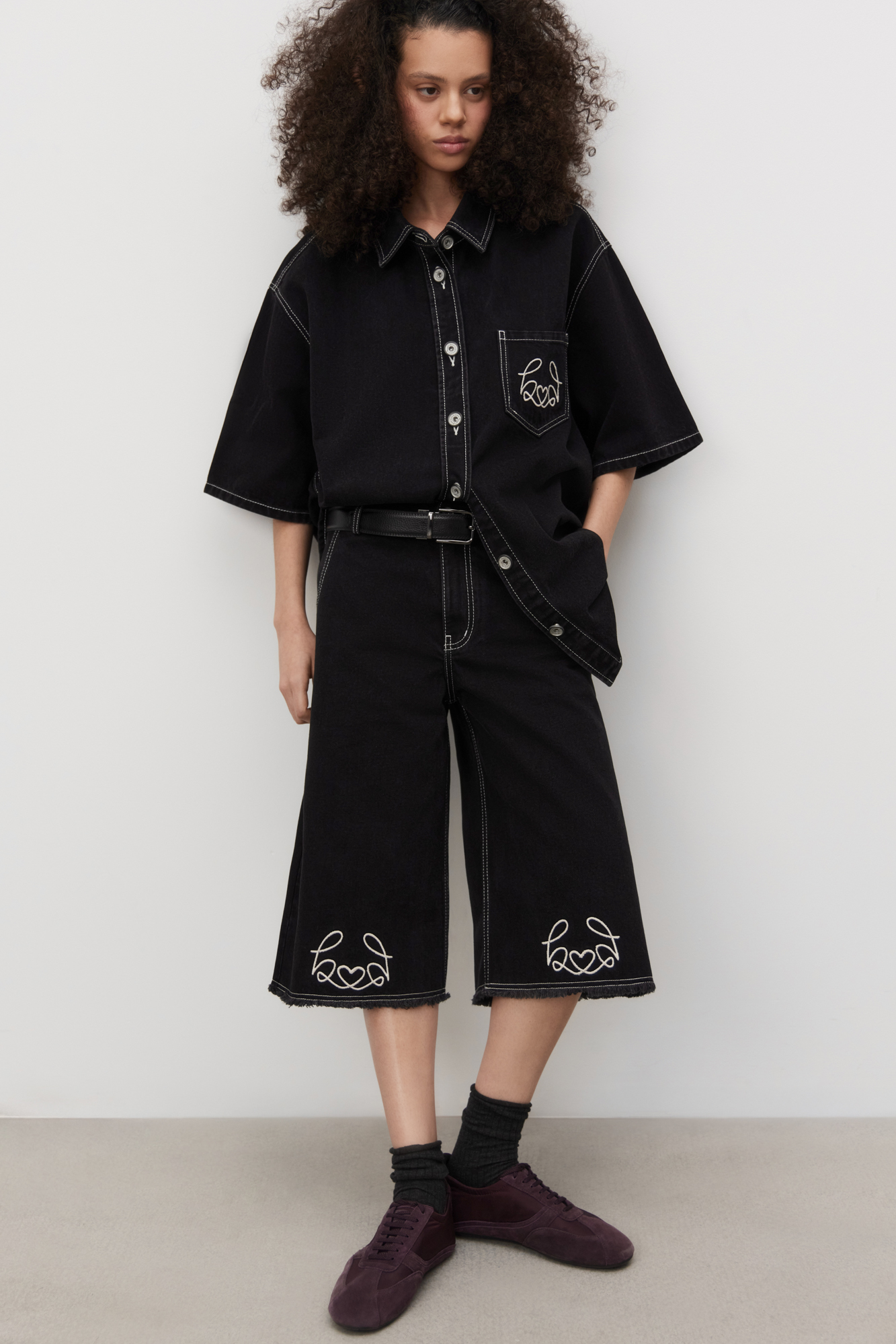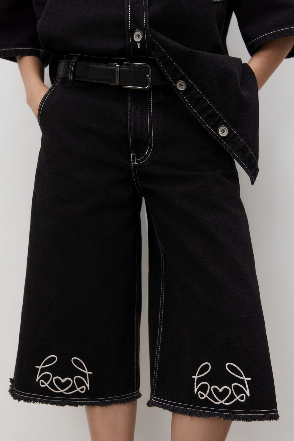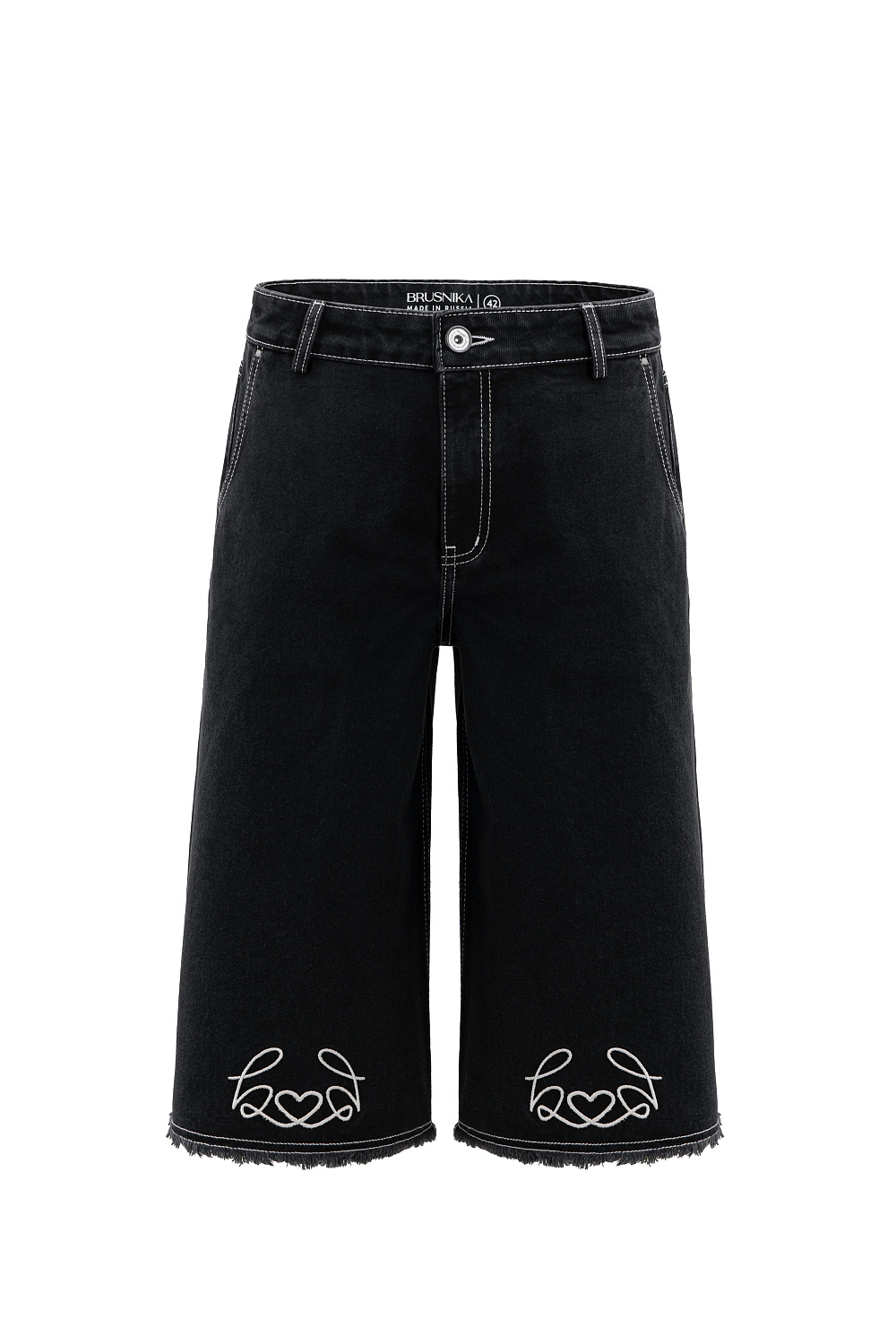 100% cotton denim bermuda shorts. The model has a wide straight cut and a low rise. The product is decorated with embroidery in the shape of hearts and decorated with fringe along the bottom edge. Fastened with a zipper and button.