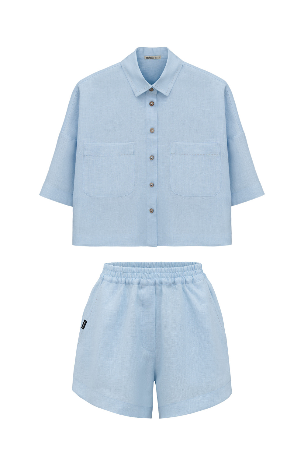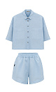 The set includes a cropped shirt with patch pockets, dropped shoulders and shorts with side pockets and an elastic waistband.