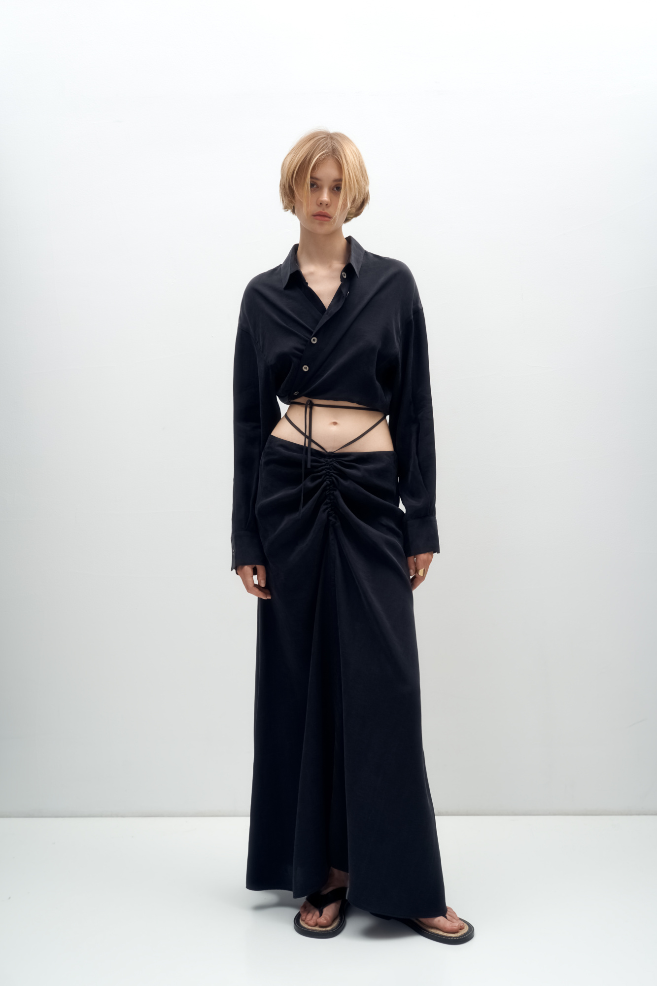 100% curpa skirt with drapping and a drawstring in the middle. Pairs with a shirt made of the same material.
