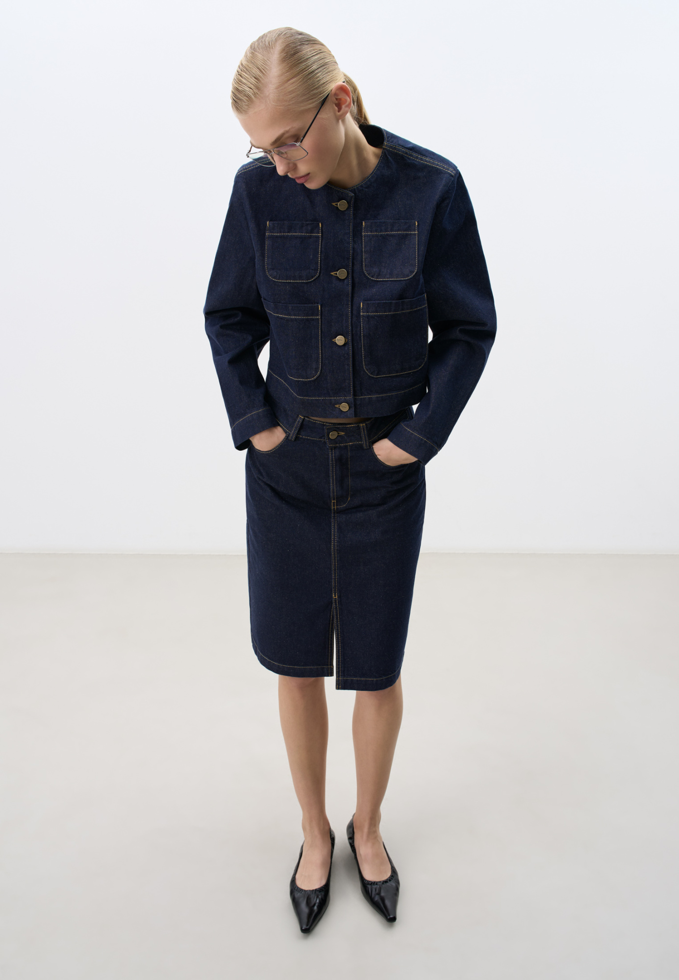 Midi length denim skirt made of 100% cotton. The model has a straight cut, with pockets, belt loops and a low slit in the front. Zip and button closure. You can complement the look with a jacket or vest.