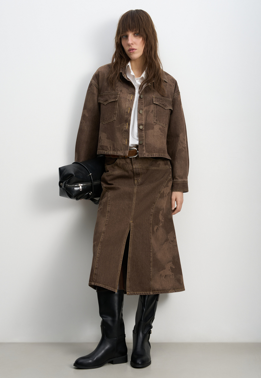 100% cotton midi length denim skirt with horse print. Features a front slit, geometric darts, side and back pockets, belt loops and metal button closure with the brand logo. The product is decorated with a laser-cut horse and horseshoe print and voluminous geometric darts.