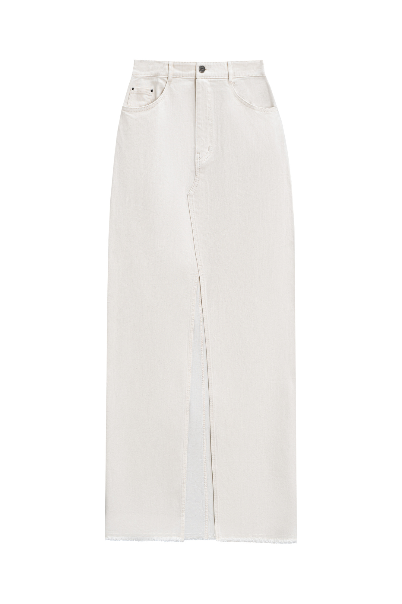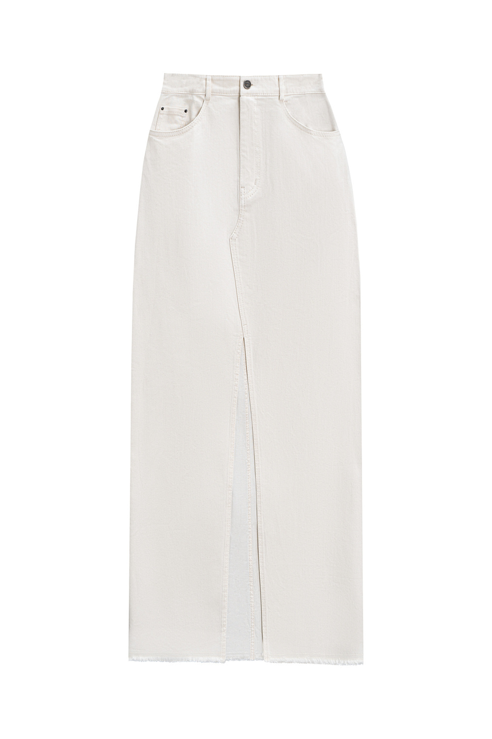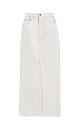 Cotton denim skirt with a front slit and raw hem.