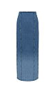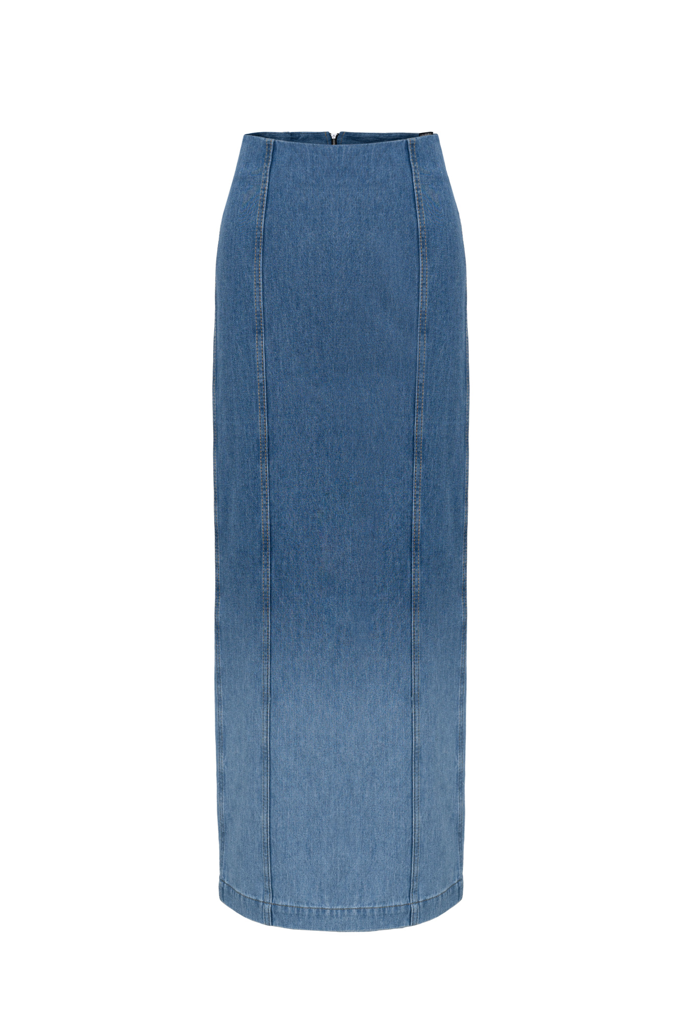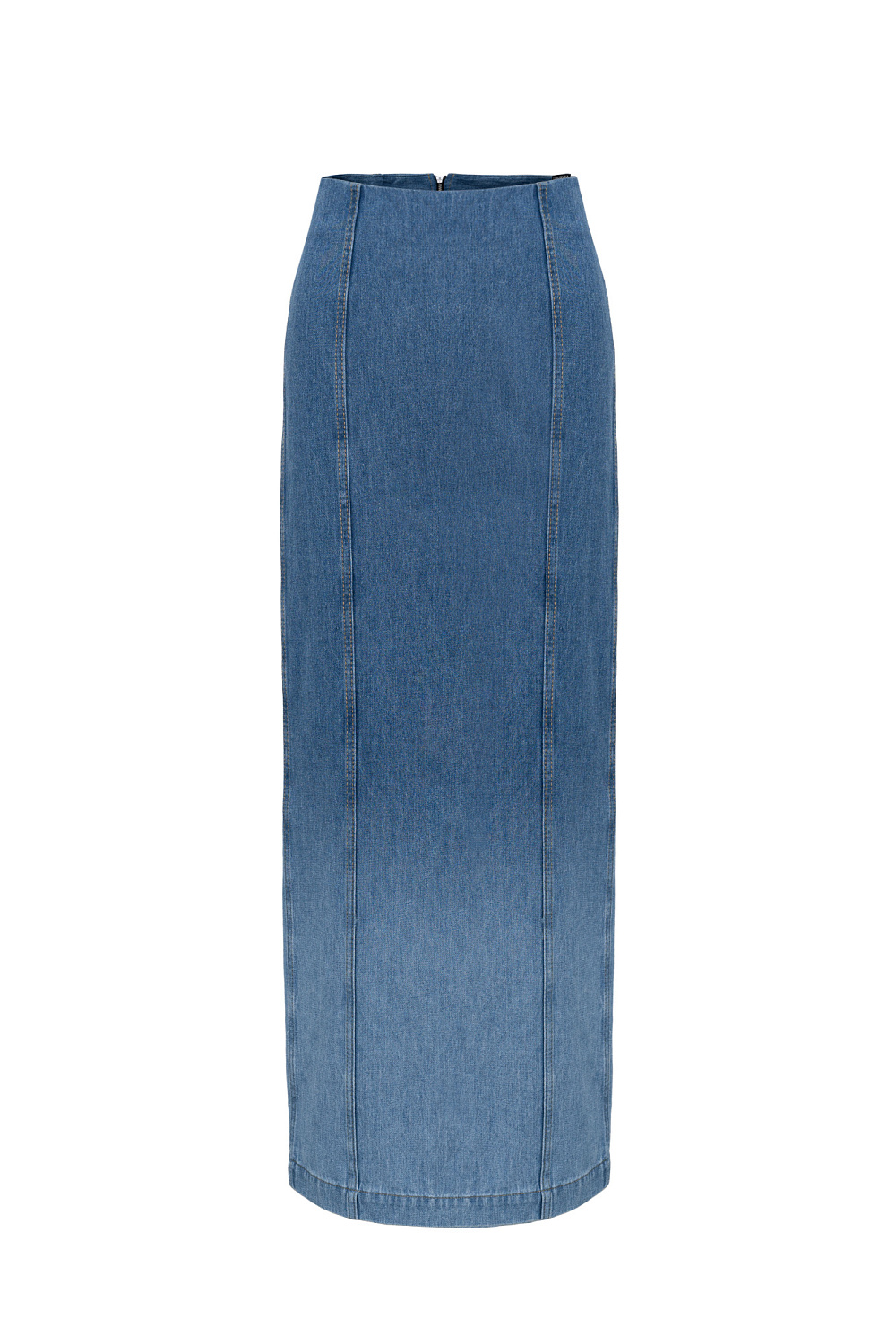 Denim fitted pencil skirt with a slit at the back and a branded label at the waist. Zip closure.
