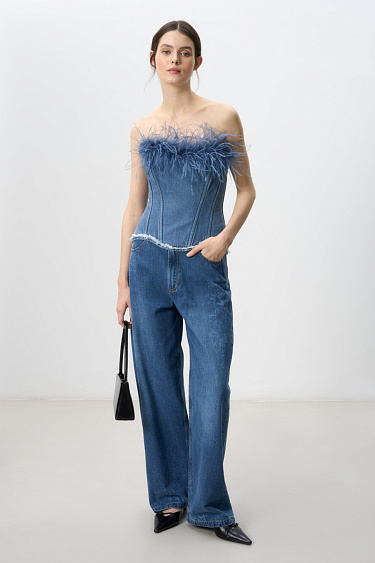 Midi-length denim skirt, decorated with a ribbon with ostrich feathers. The ribbon with feathers is detachable. The product is fastened with a zipper and a button. Two pockets, belt loops on the waistband.
