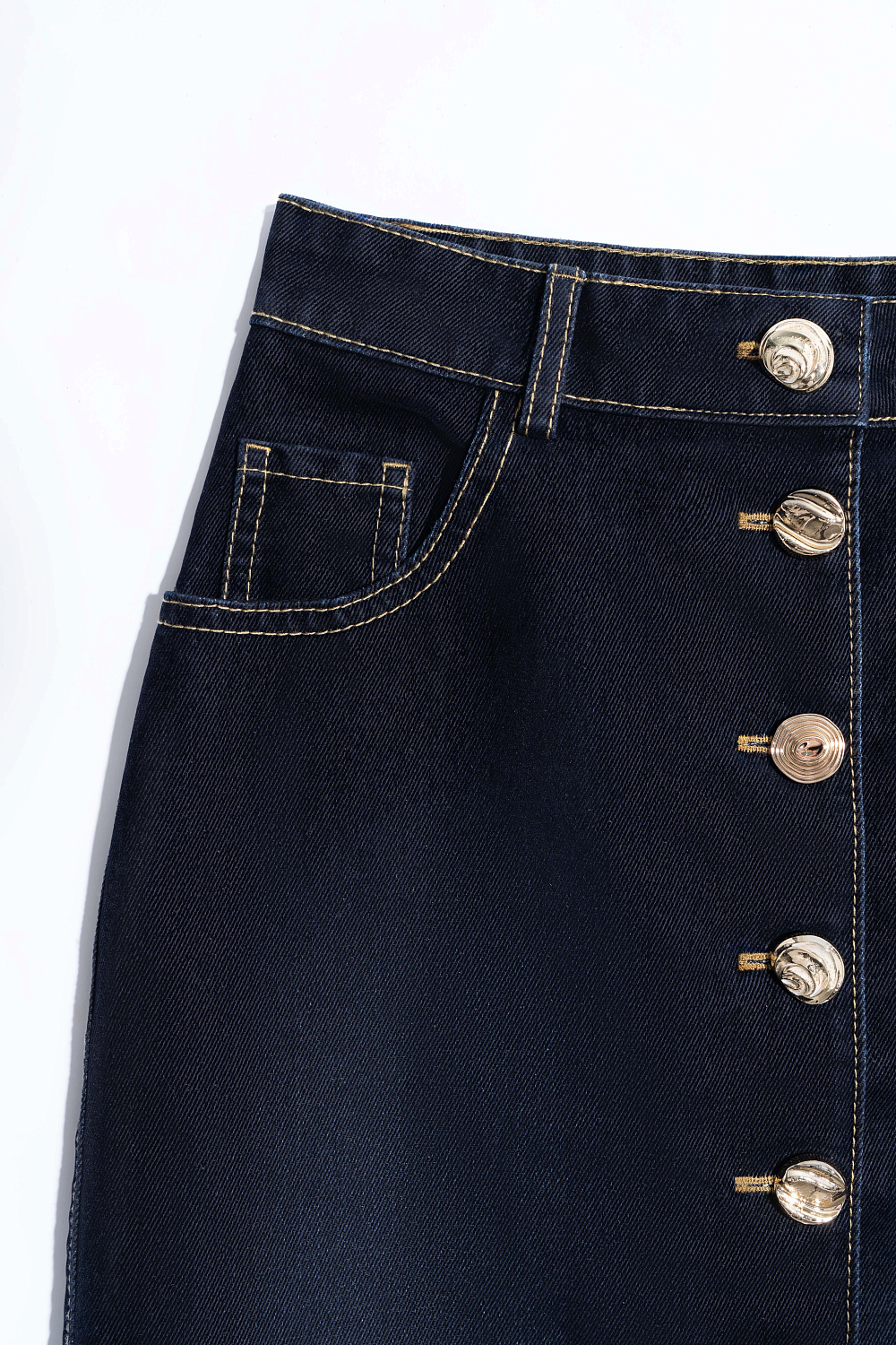 Midi-length skirt made of flocked denim - 100% cotton with an imitation velvet texture. Straight silhouette model with pockets and decorative button closure.