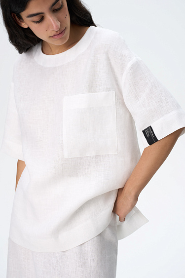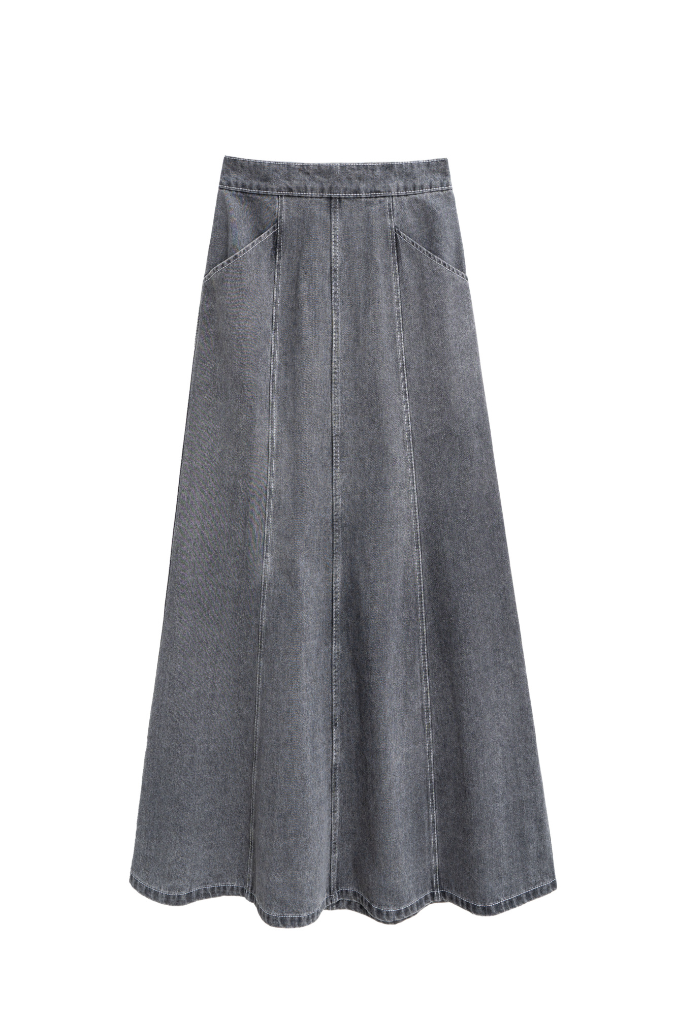 Denim skirt made of 100% cotton, midi length. A-line model with voluminous vertical seams, two welt pockets at the front and two patch pockets at the back. Zip closure.