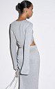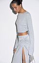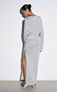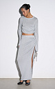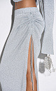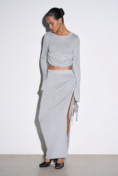Maxi skirt with slit, elastic ribbed waistband and side drawstring. The skirt crafted from a blend of viscose and metallic fibre.