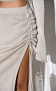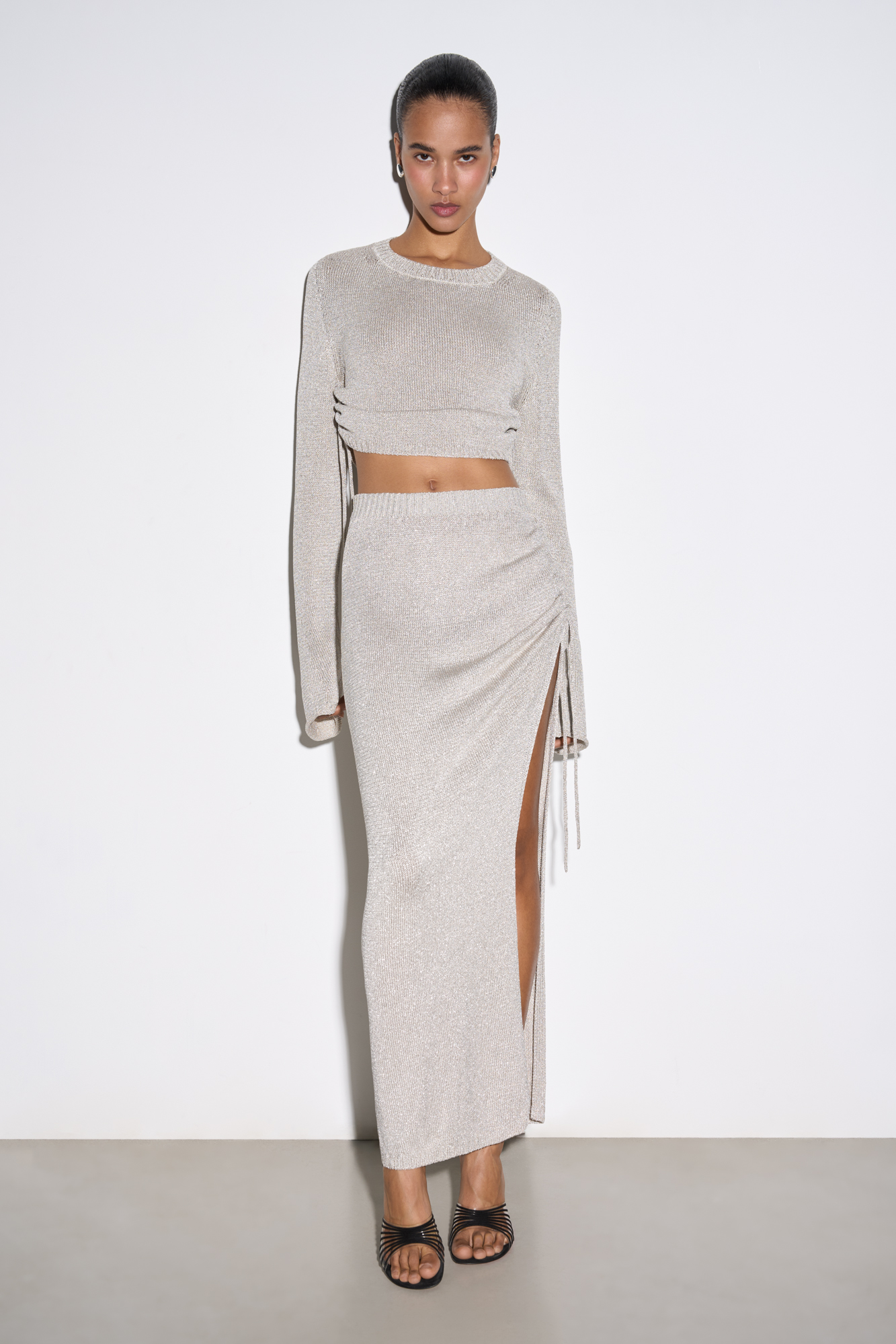 Maxi-length knitted skirt made of viscose with lurex. The model has a form-fitting silhouette, with an elastic ribbed waistband and a slit from the hip with a drawstring. You can complement the look with a top in the same style.
