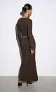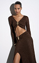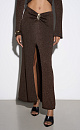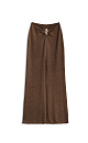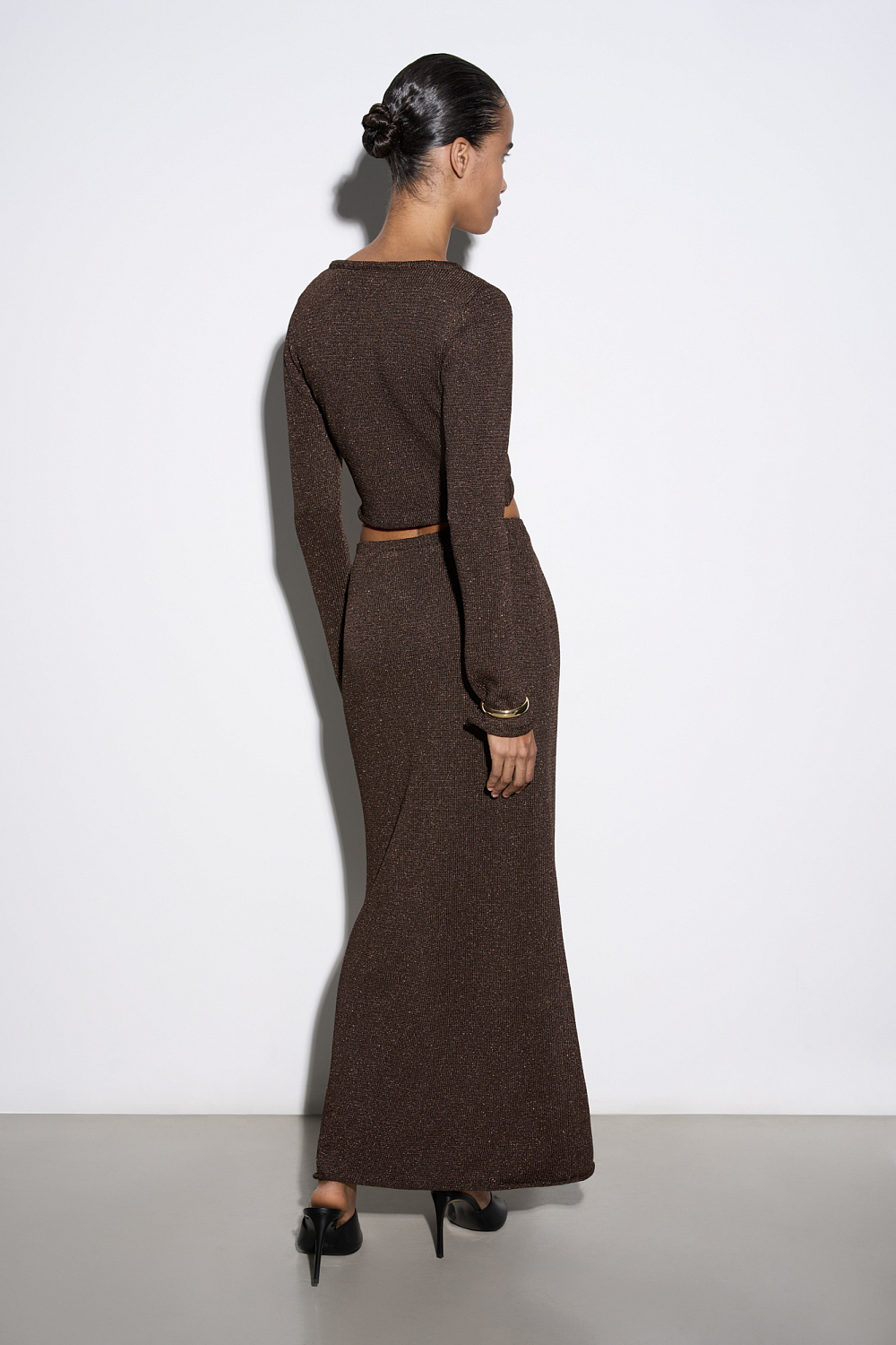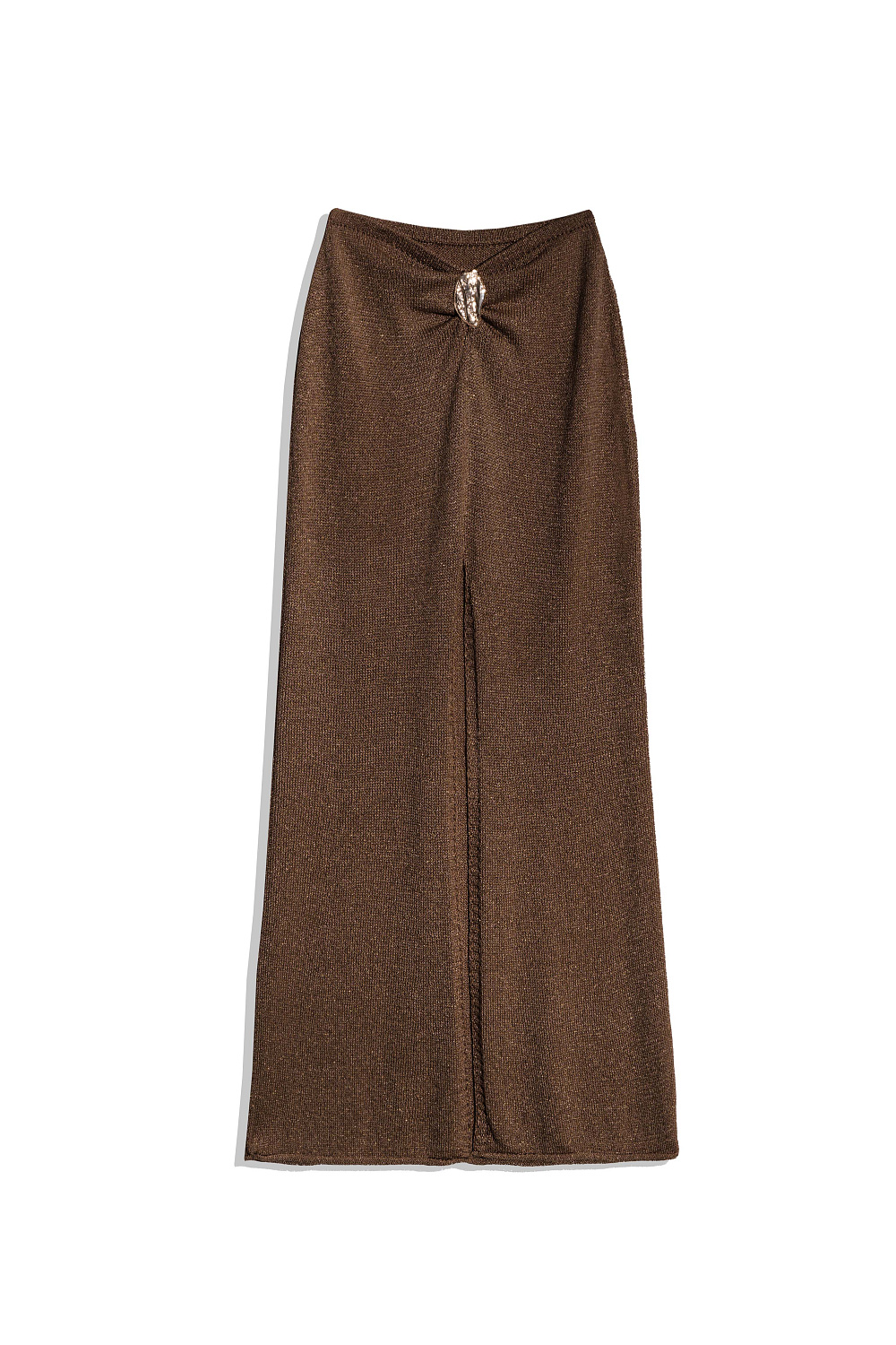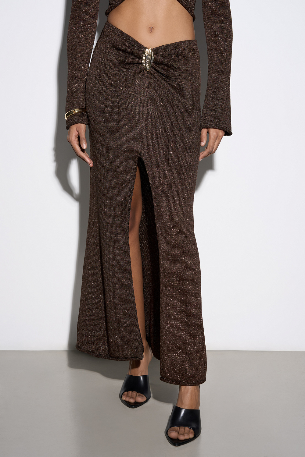 Maxi-length knitted skirt made of viscose with lurex. Model with a high slit at the front, a roll at the hem and an accent element at the waistband.