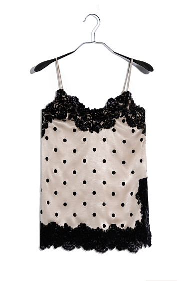 Midi length satin polka dot skirt. Fitted model with hidden zipper closure. The hem of the product is decorated with lace.