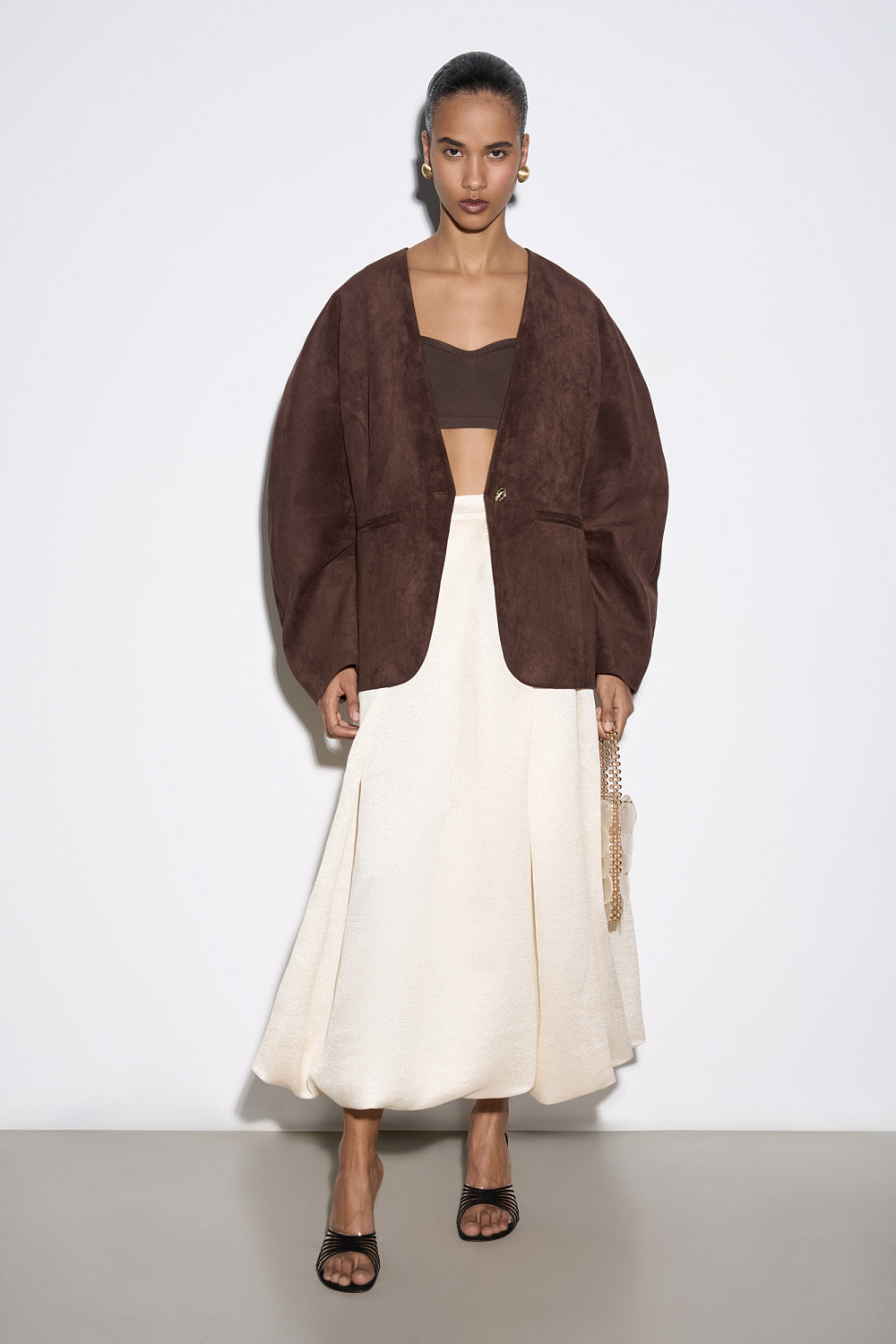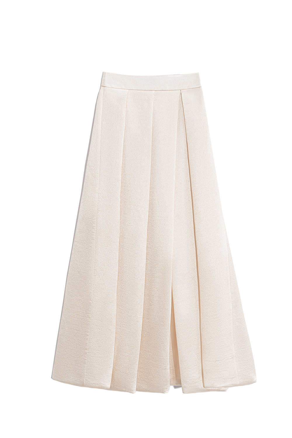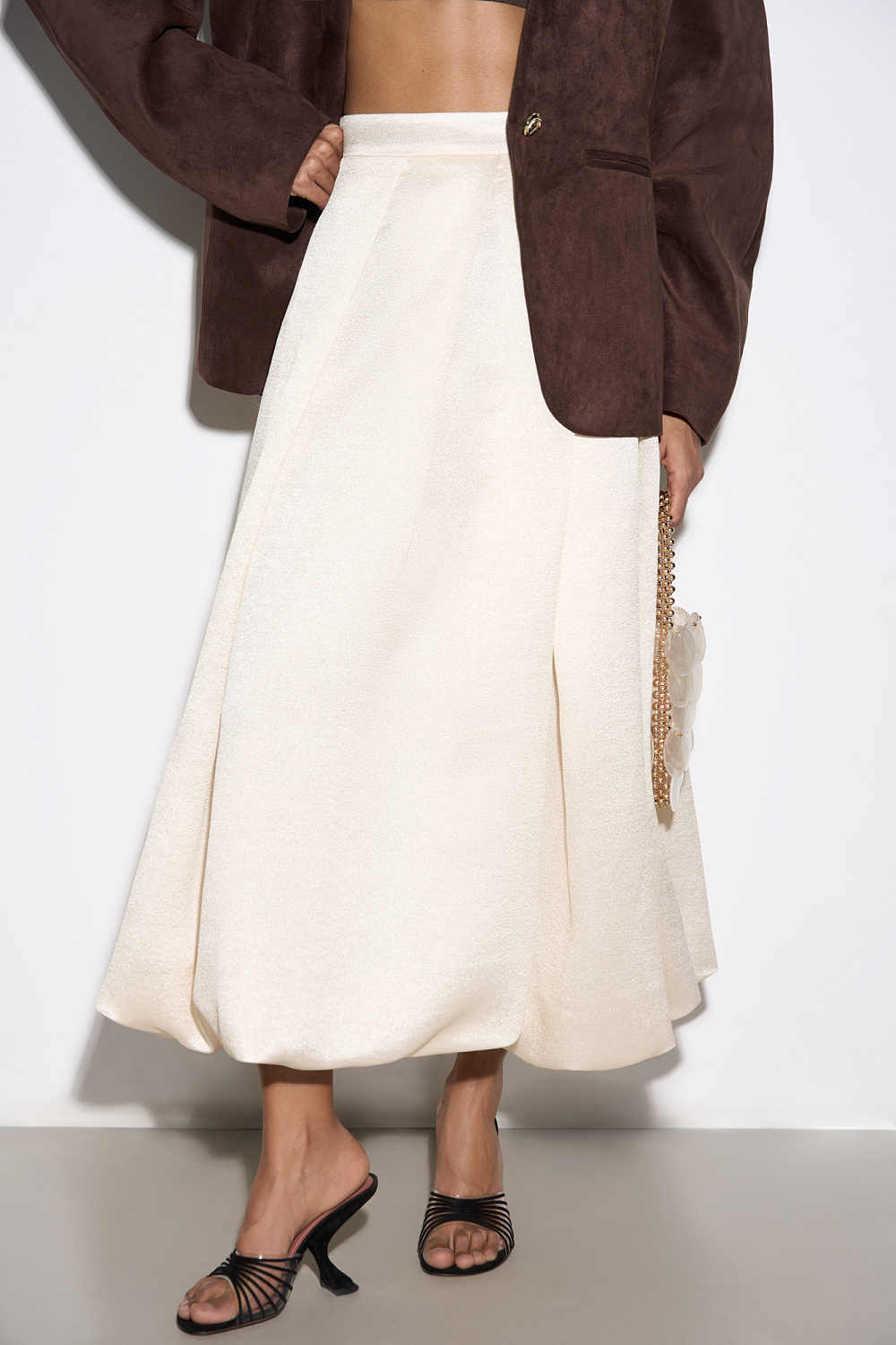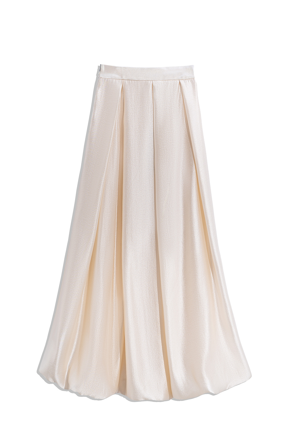 Midi-length balloon skirt made of satin fabric. The model is made in a large fold. Concealed zip fastening.