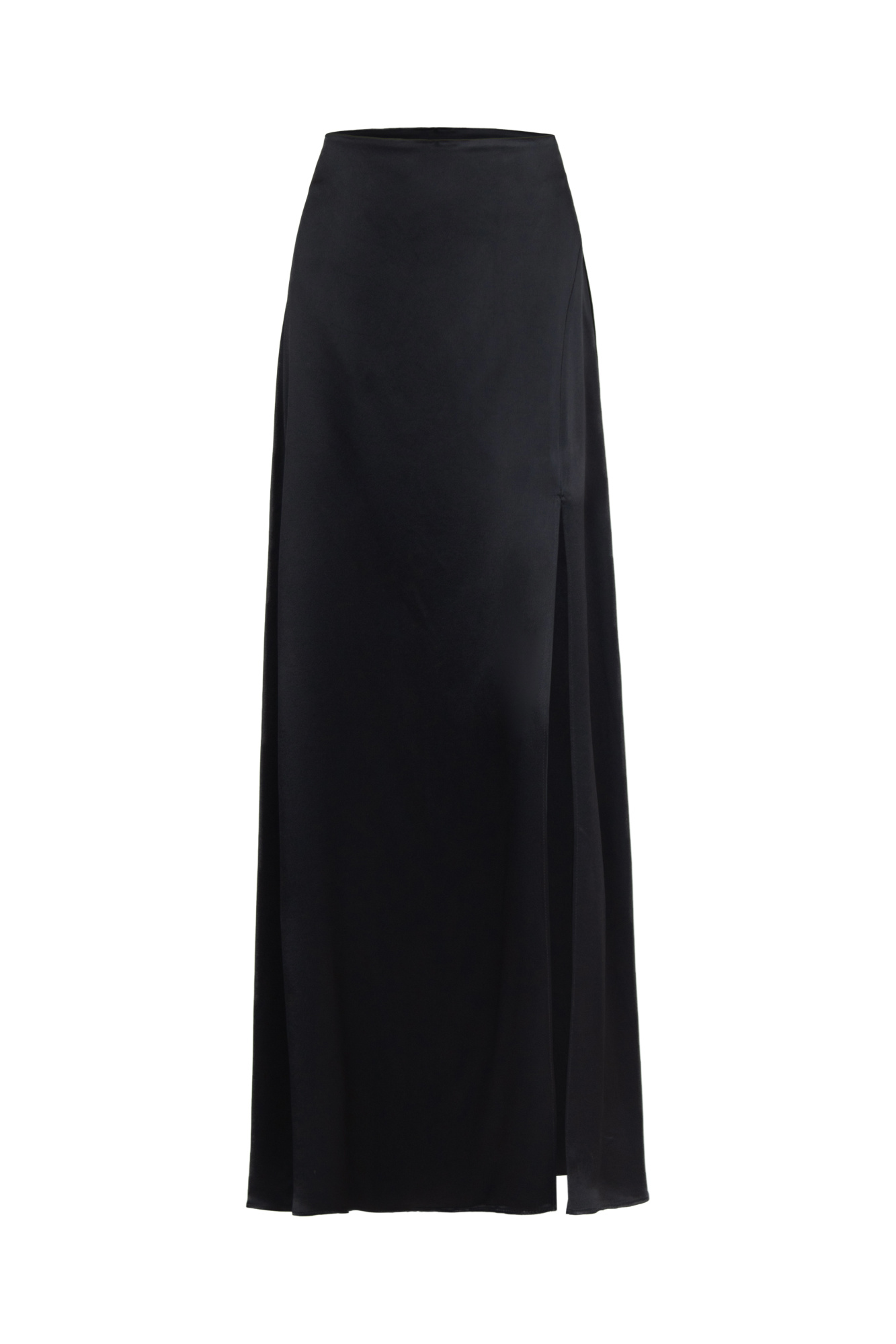 100% viscose satin skirt with a slit and zip fastening.