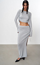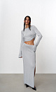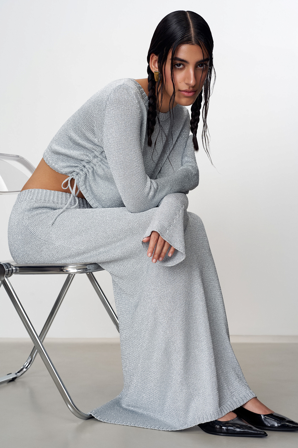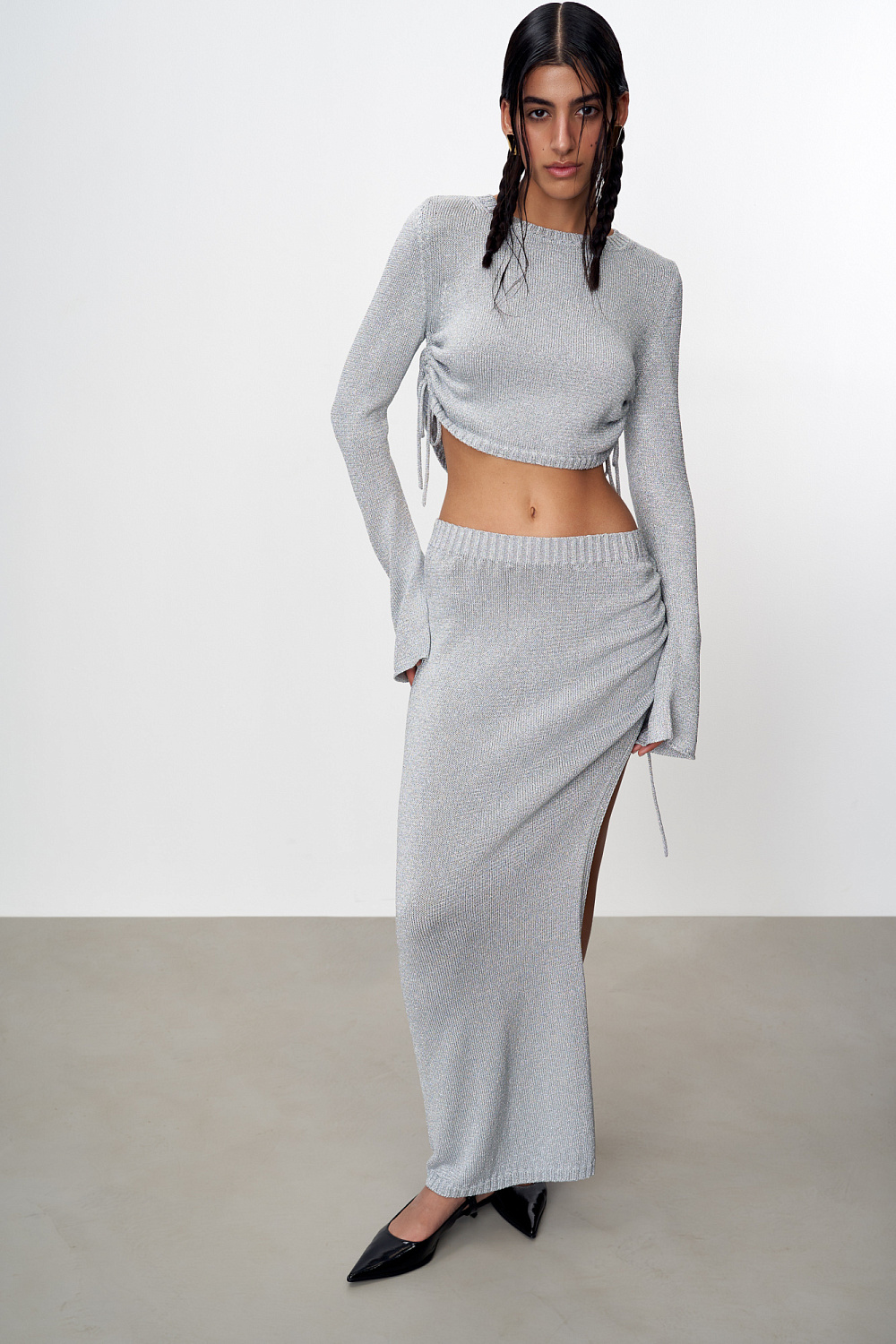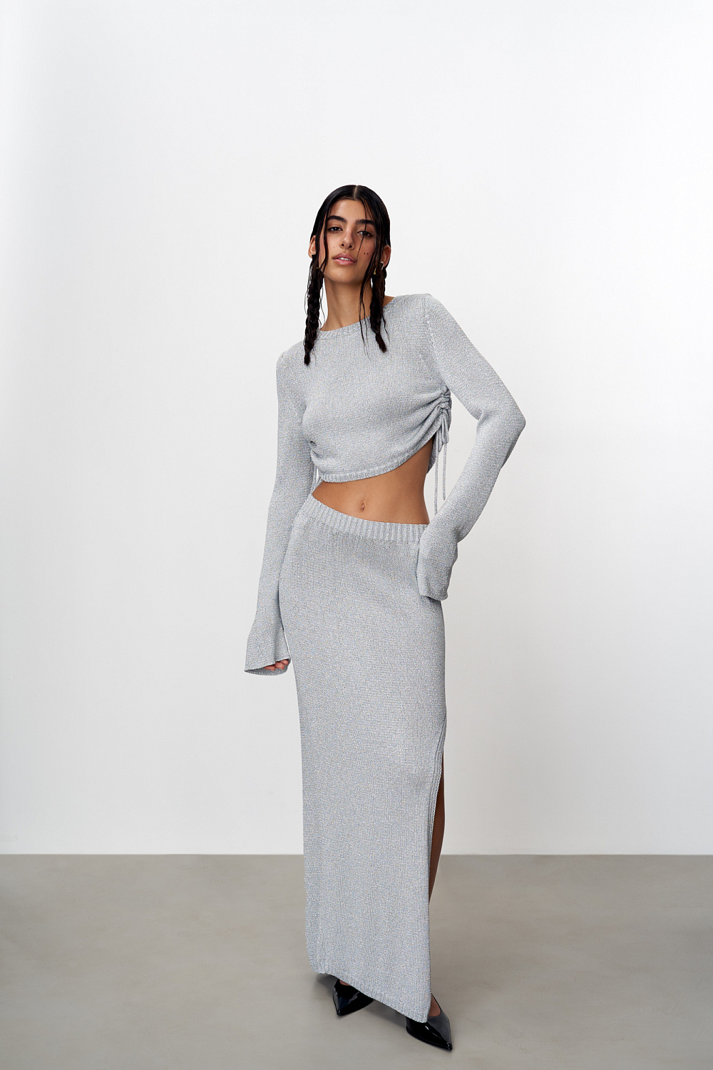 Maxi skirt with slit, elastic ribbed waistband and side drawstring. The skirt crafted from a blend of viscose and metallic fibre.