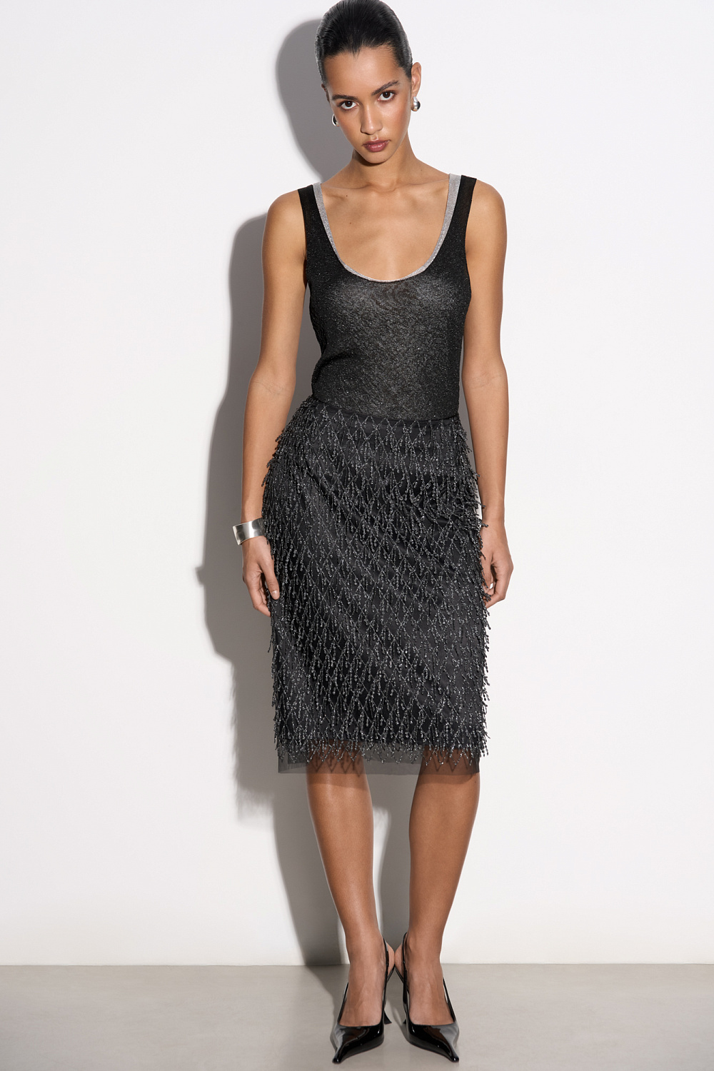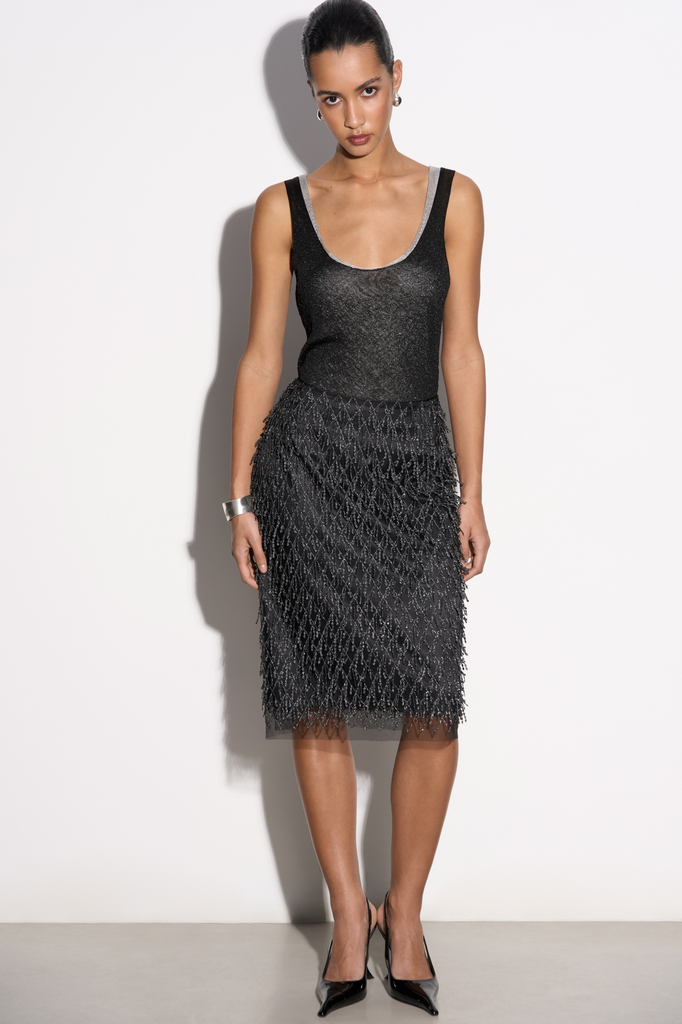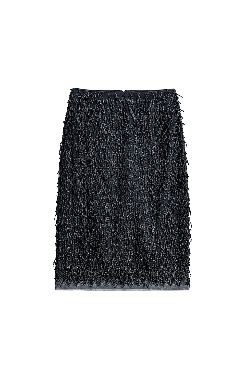 Midi-length skirt with a voluminous geometric design and fringe. Zip fastening at the back. The product is lined.