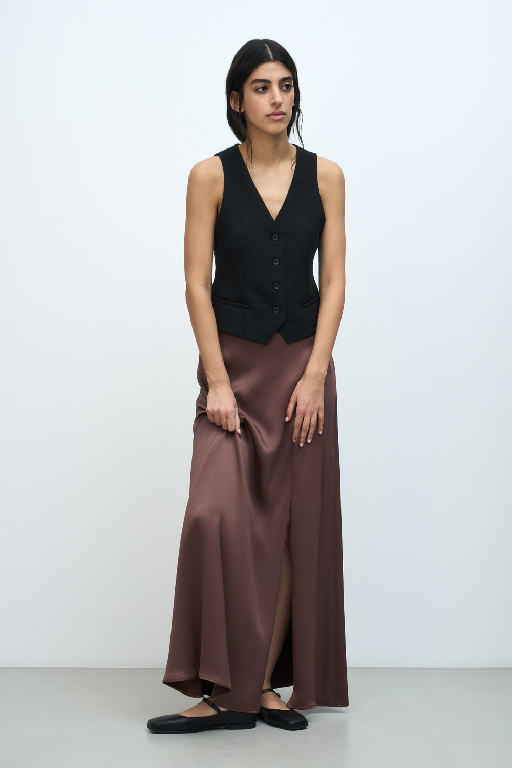 100% viscose satin skirt with a slit and zip fastening.