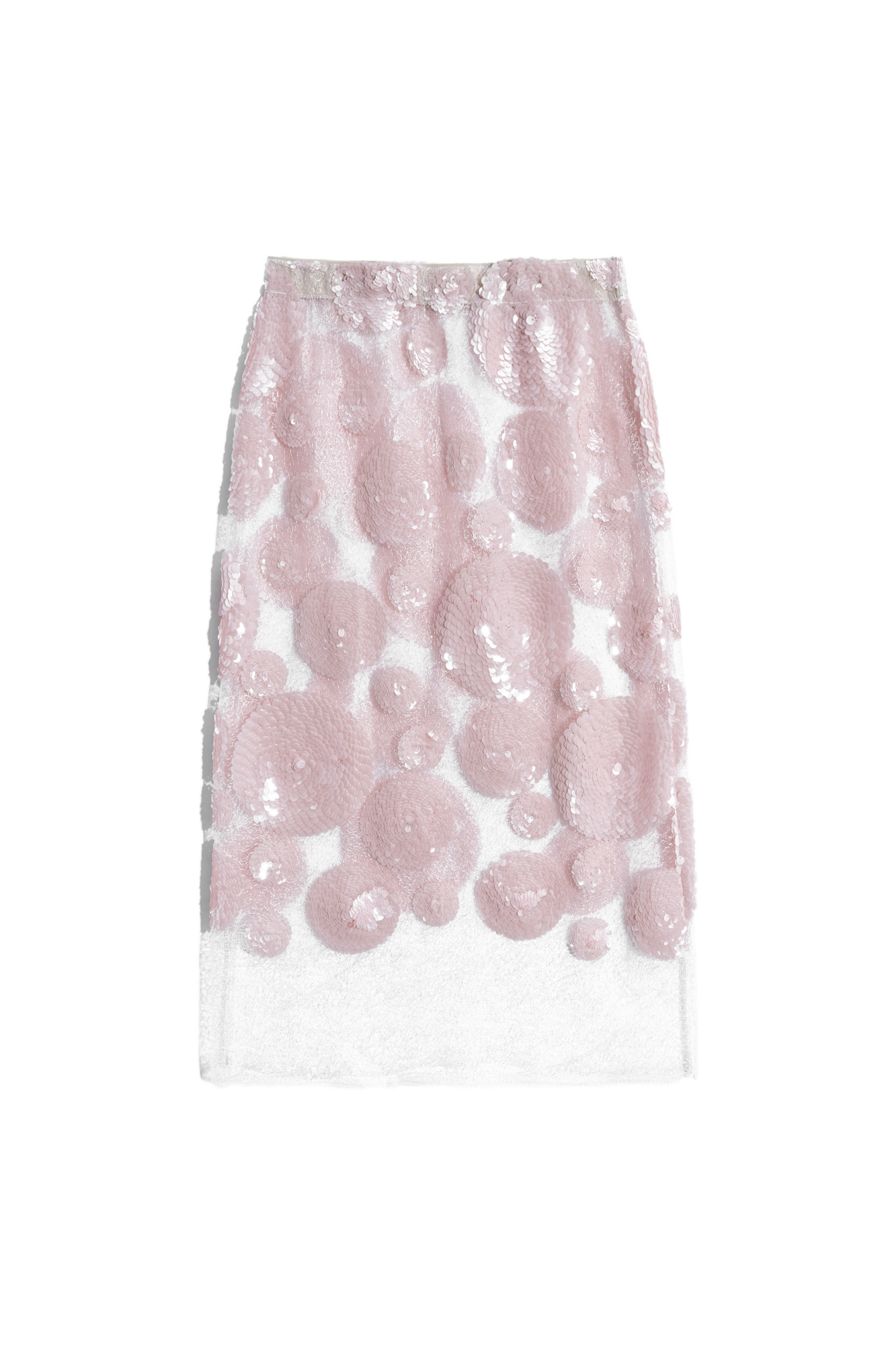 Midi-length skirt with geometric patterns embroidered with sequins. Concealed zip fastening. The product is lined.