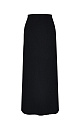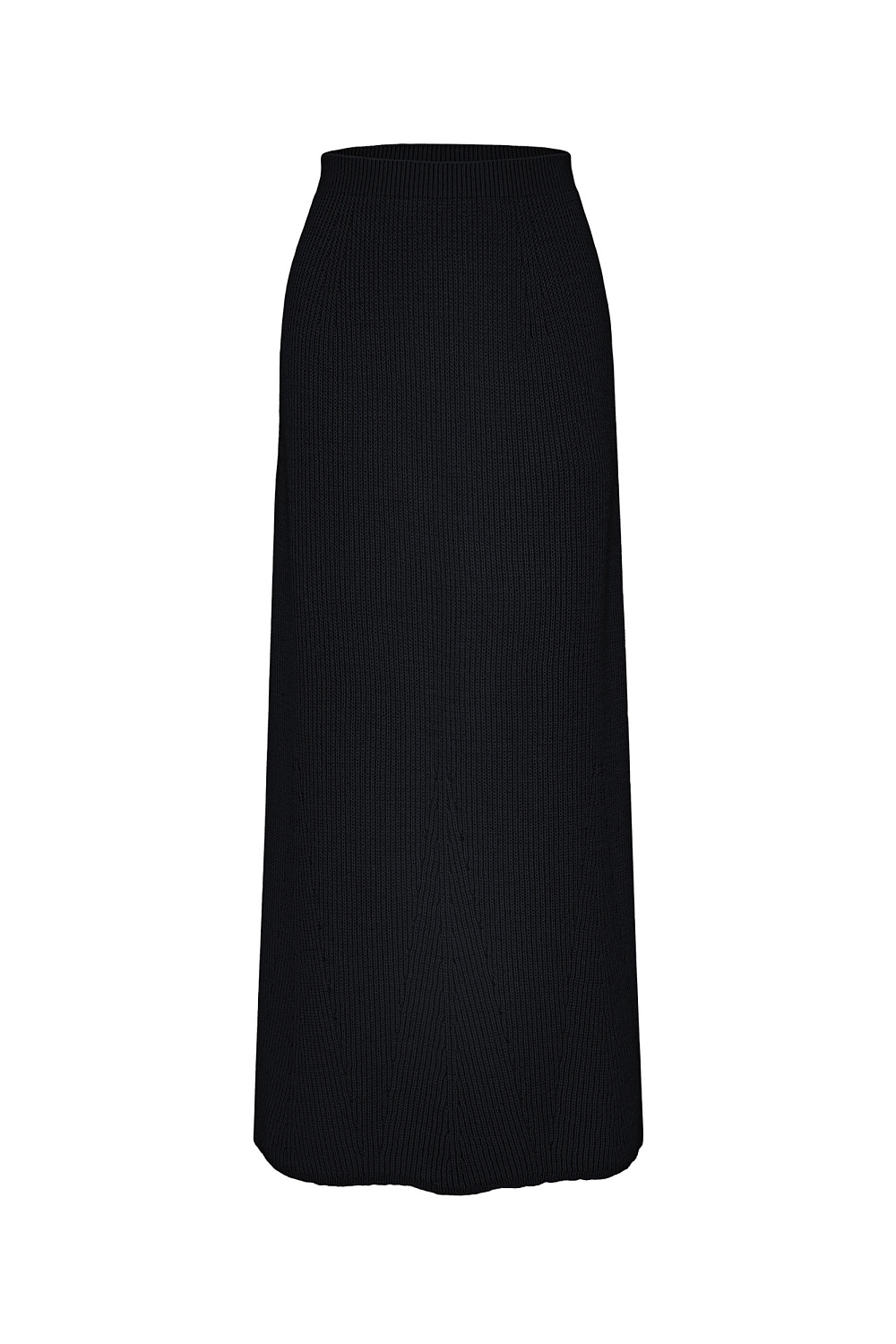 Loose knit maxi skirt with elastic ribbed waistband. You can complete the look with a vest in the same style.
