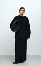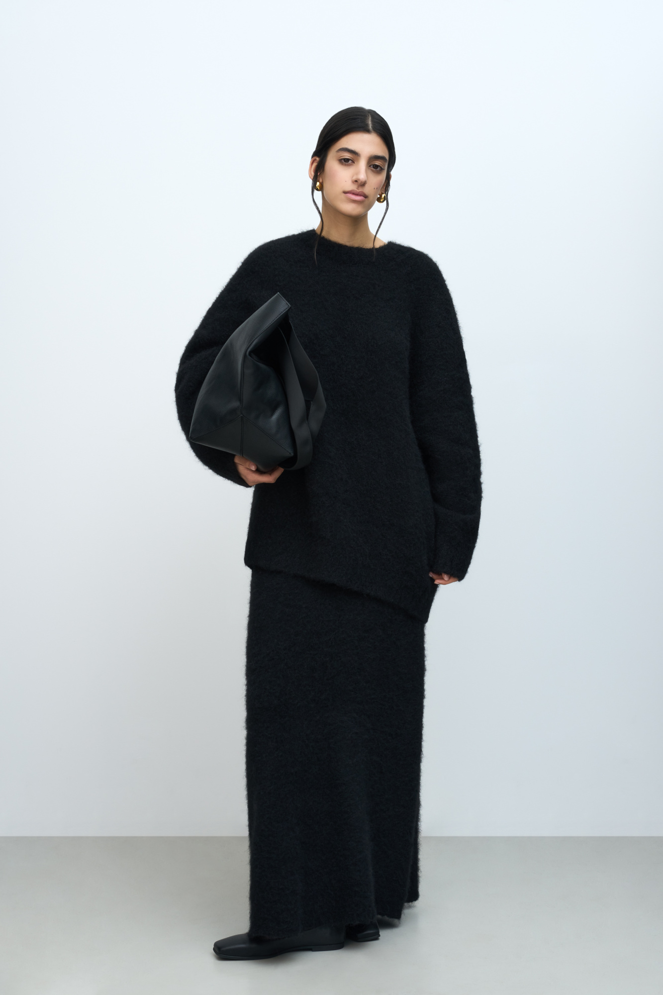 Knitted skirt made of fluffy yarn based on alpaca wool. The model has a fitted maxi length silhouette with an elastic waistband.