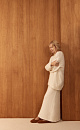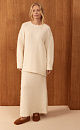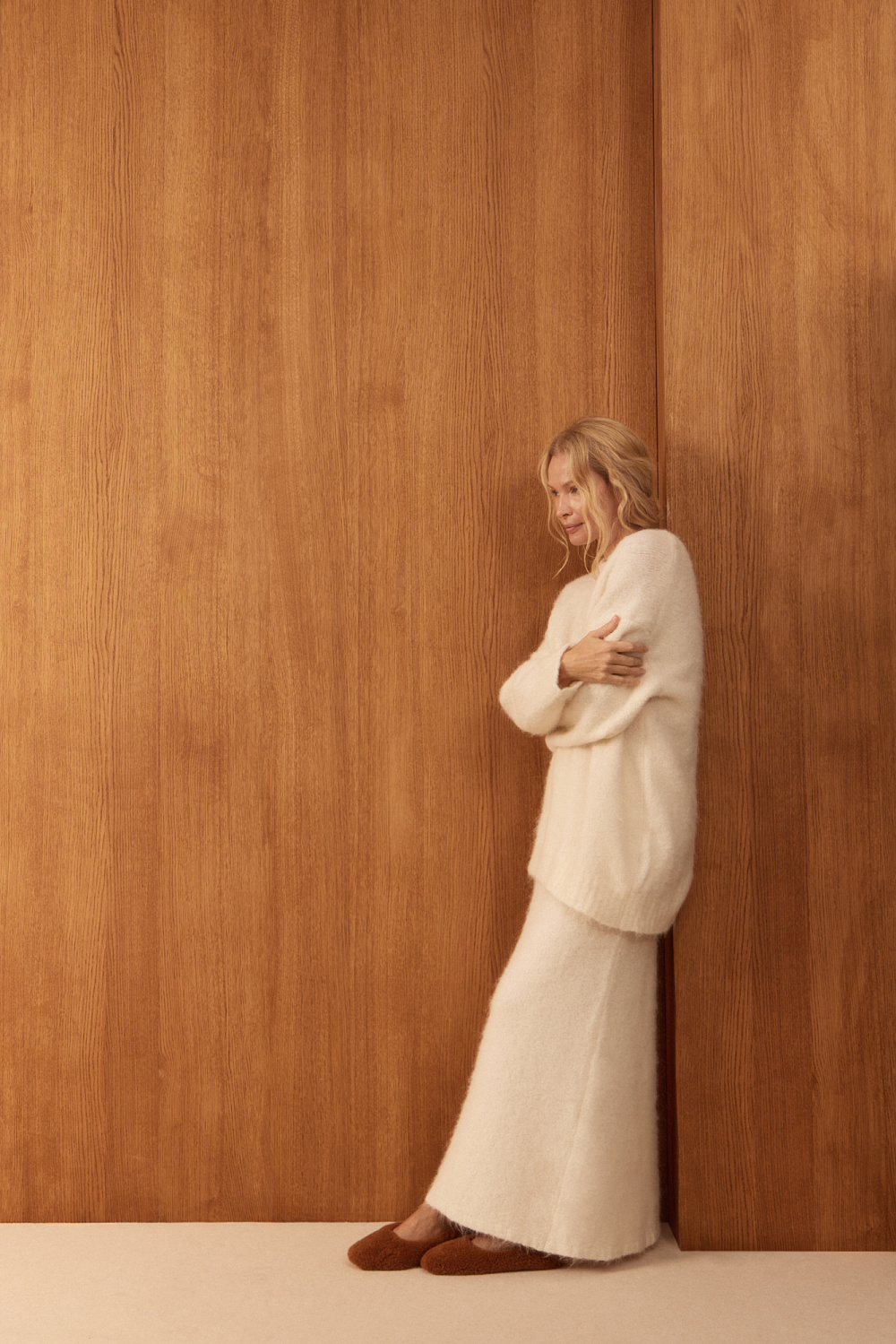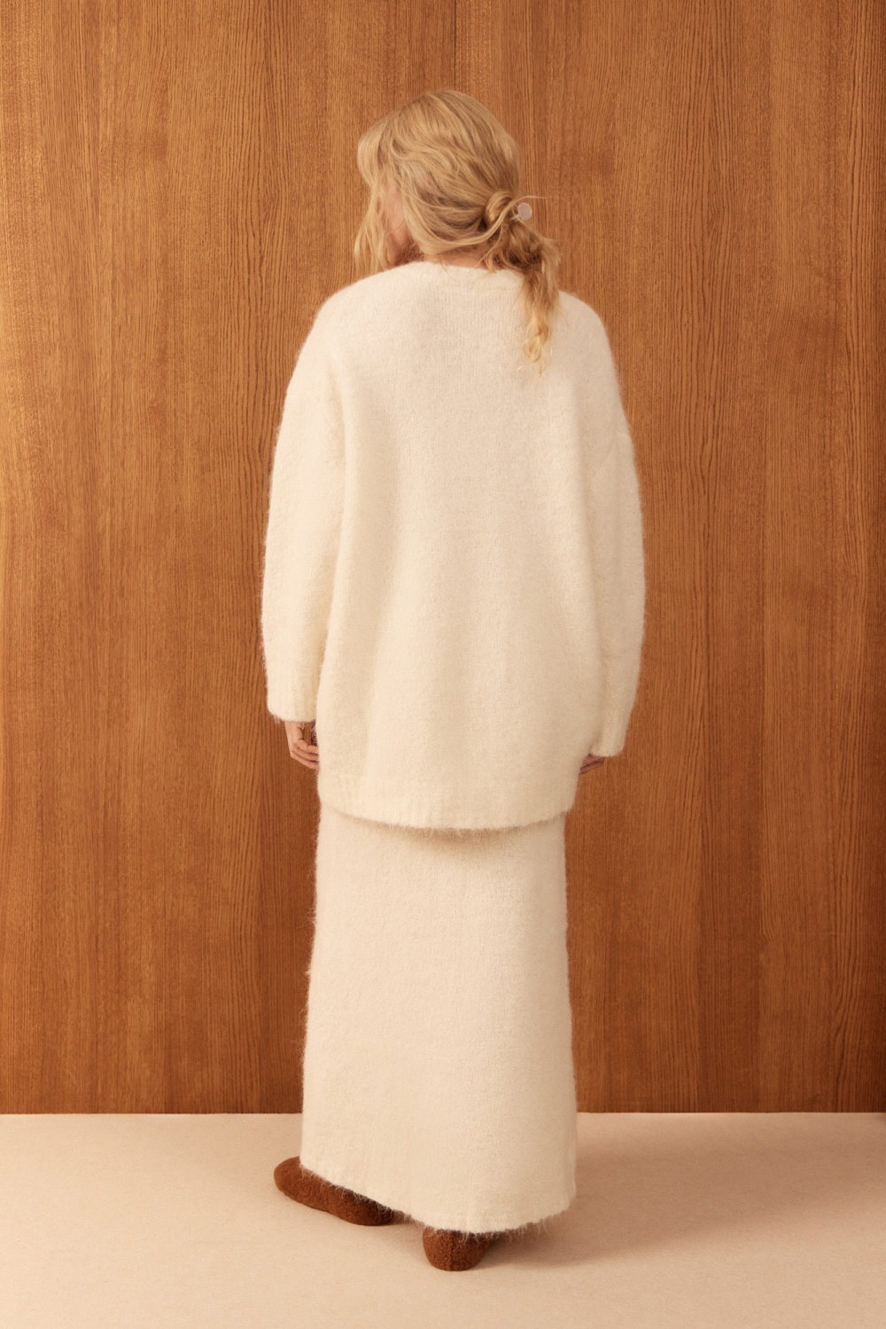 Knitted skirt made of fluffy yarn based on alpaca wool. The model has a fitted maxi length silhouette with an elastic waistband.