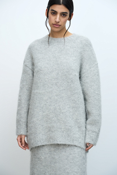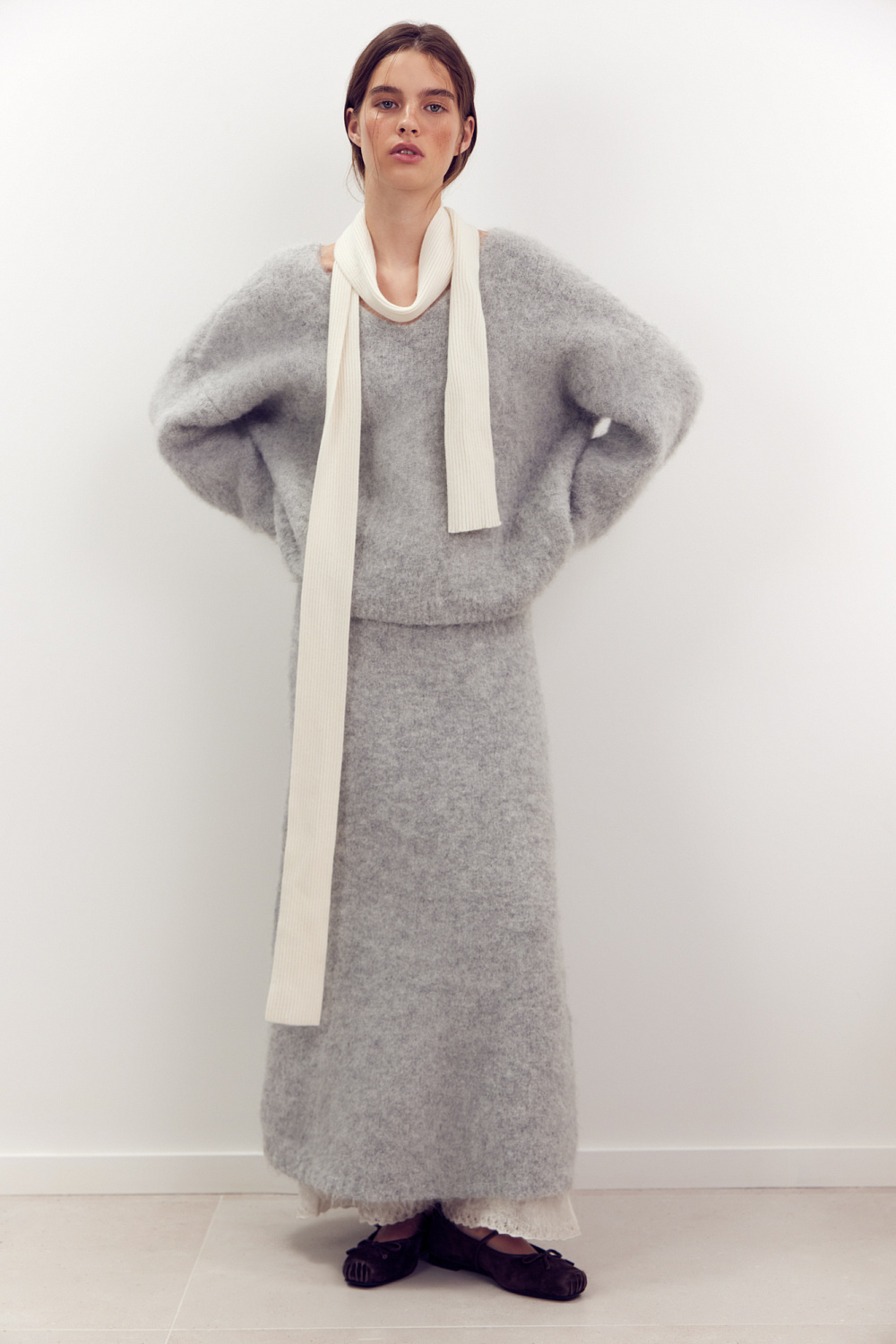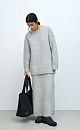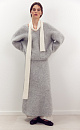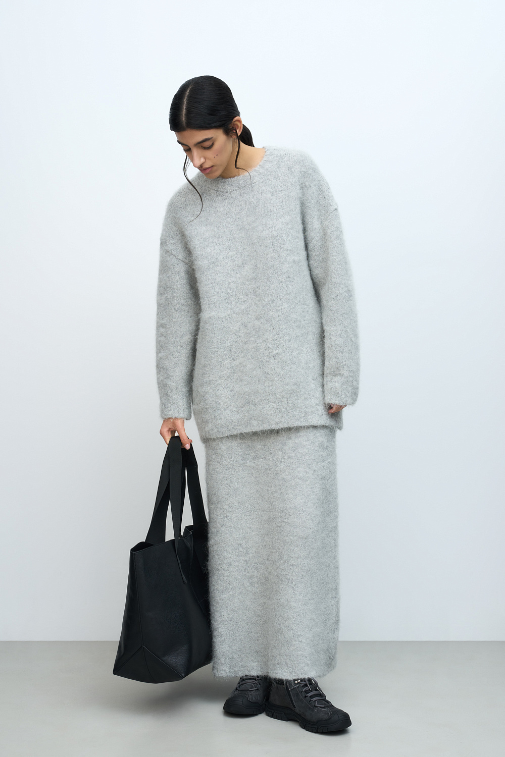 Knitted skirt made of fluffy yarn based on alpaca wool. The model has a fitted maxi length silhouette with an elastic waistband.