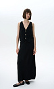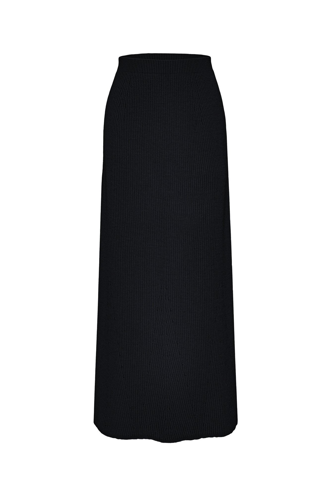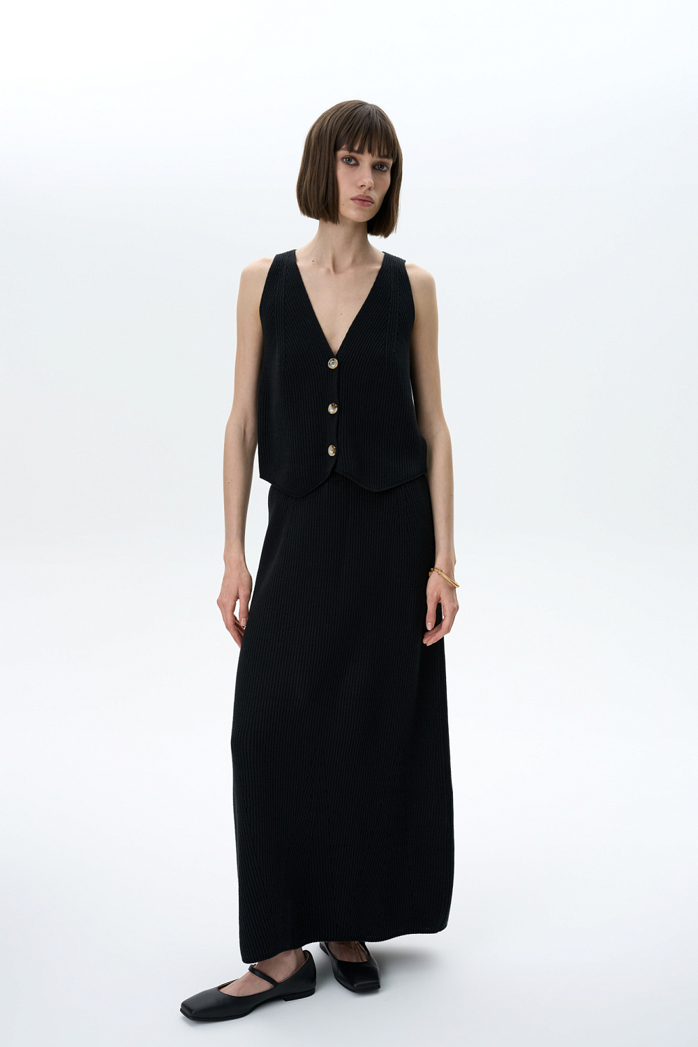 Loose knit maxi skirt with elastic ribbed waistband. You can complete the look with a vest in the same style.