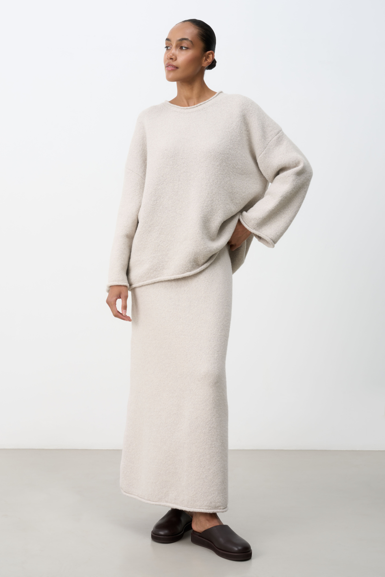 Mask-length A-line skirt with elastic ribbed drawstring waistband. The bolsters on the bottom are ideal. You can complement the look with a jumper in the same style.
