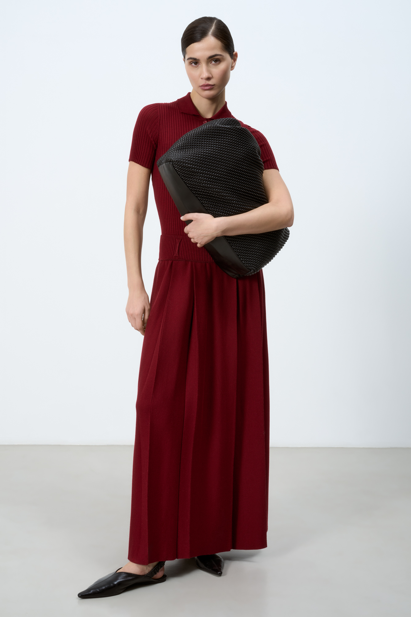 Knitted maxi-length skirt made of wool with the addition of acrylic. The model has a straight fit, with large counter pleats, a wide ribbed elastic waistband and belt loops.