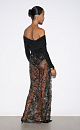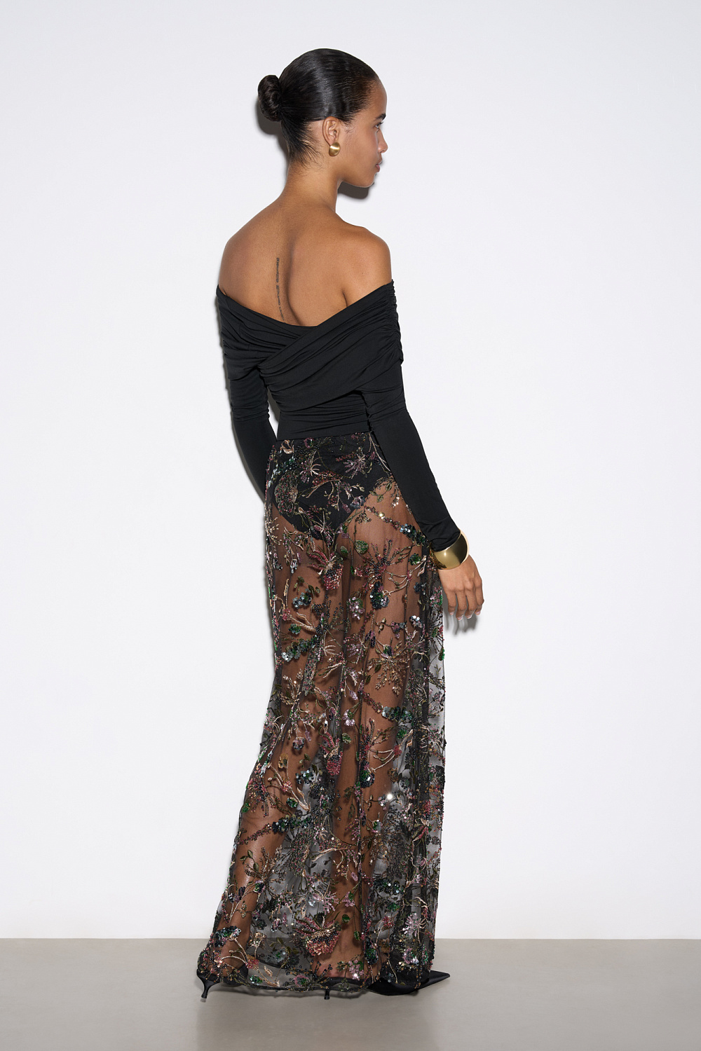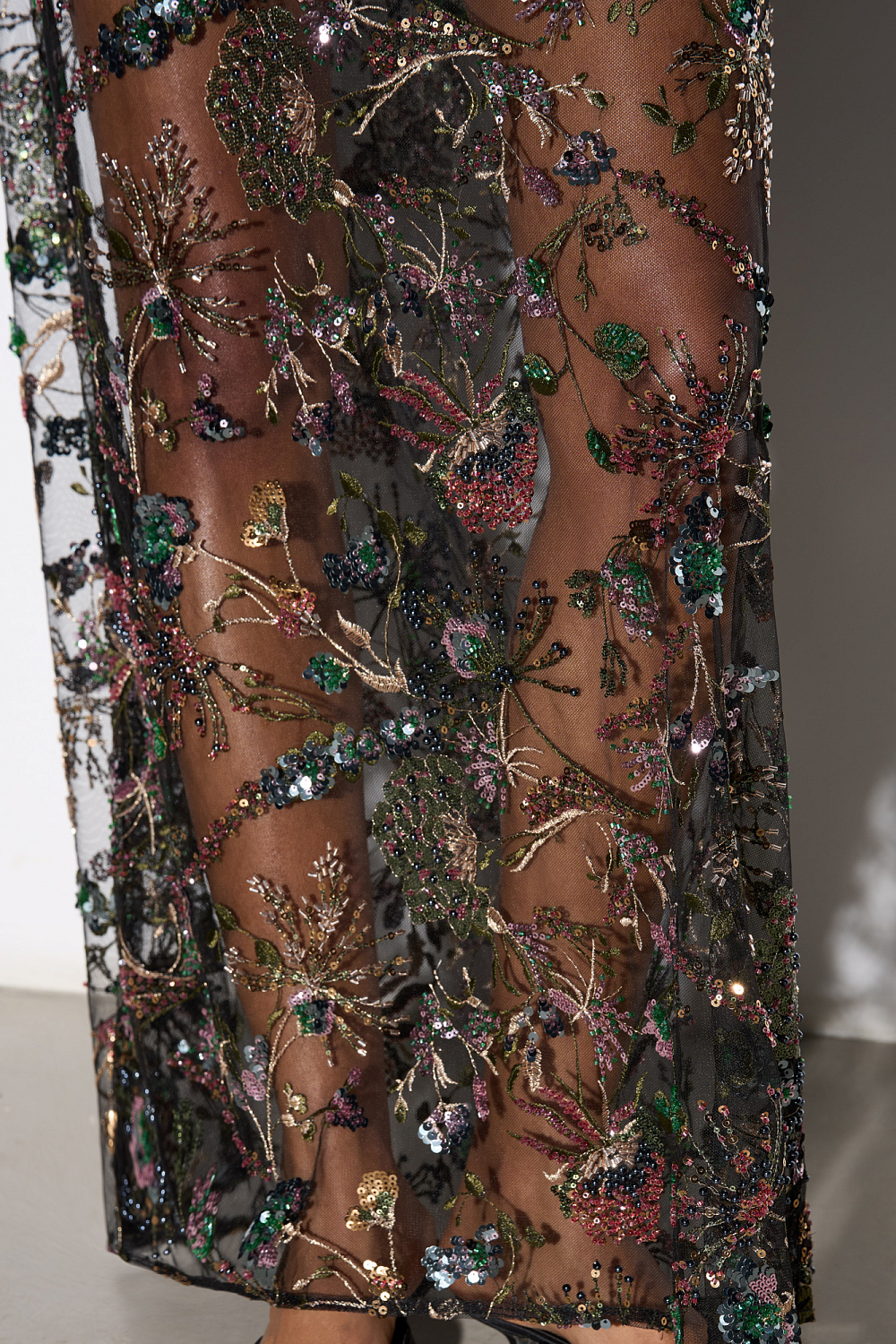 Maxi length skirt with floral patterns embroidered with sequins and beads. Concealed zip fastening. The product is unlined.