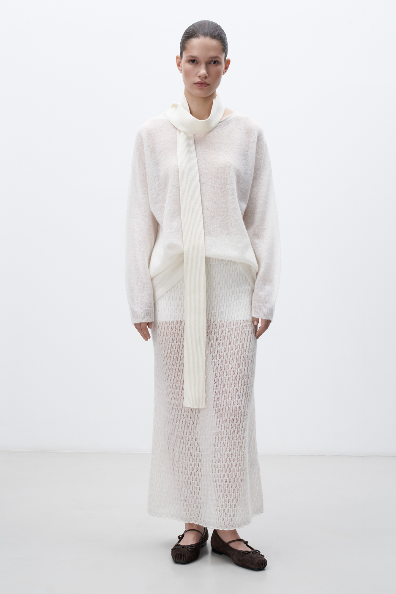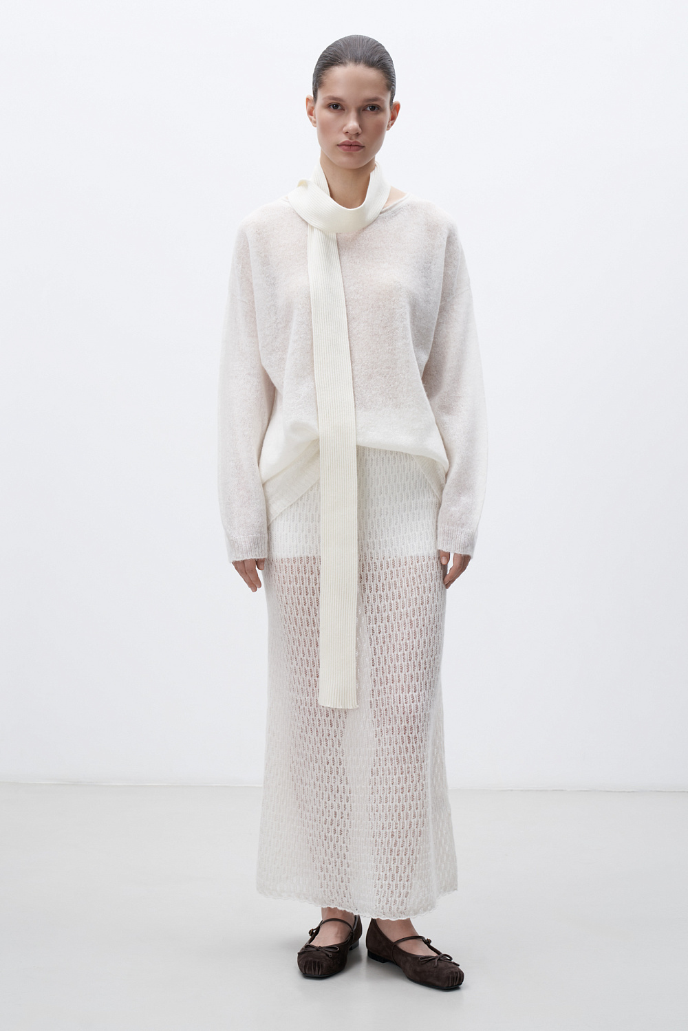 Openwork maxi-length skirt made of merino wool with the addition of alpaca wool. Elastic ribbed waistband. No lining.