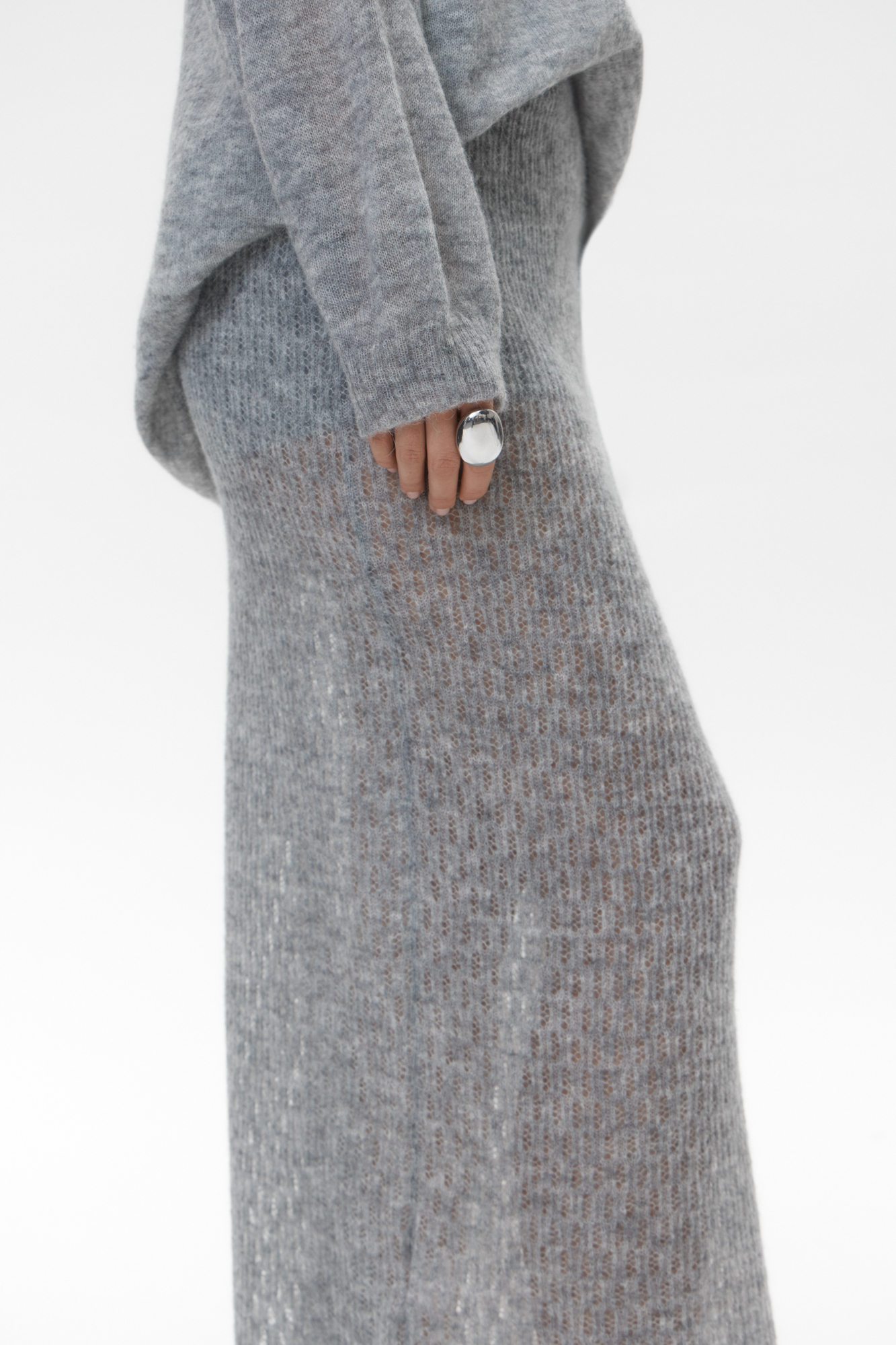 Openwork maxi-length skirt made of merino wool with the addition of alpaca wool. Elastic ribbed waistband. No lining.