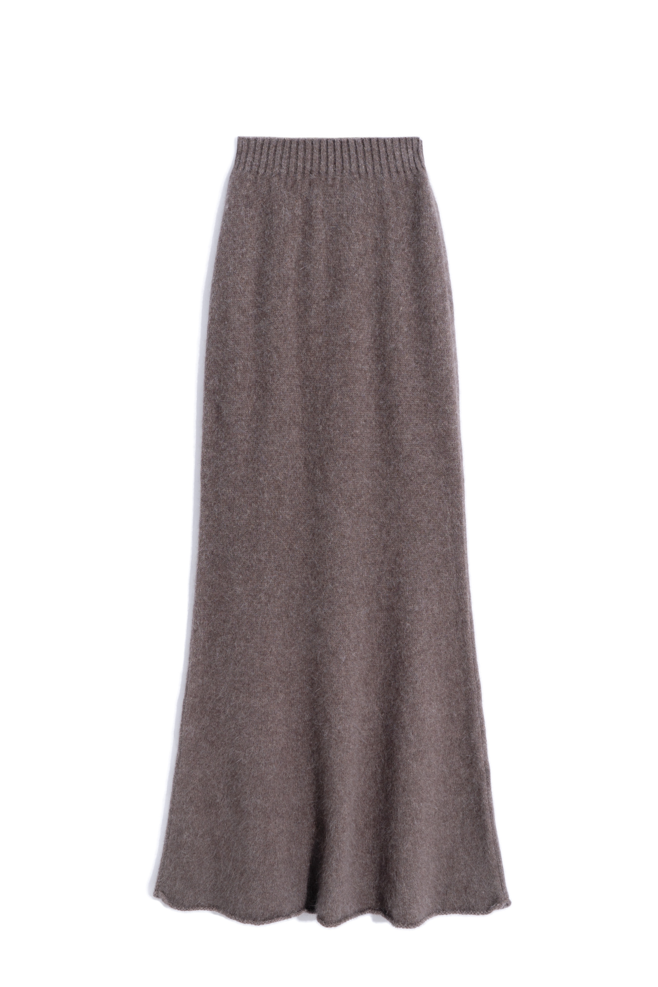 Knitted maxi skirt made of fox fur. A-line model, with an elastic waistband and a roll at the bottom of the hem. You can complement the look with a jumper in the same style.